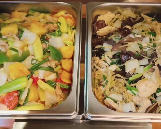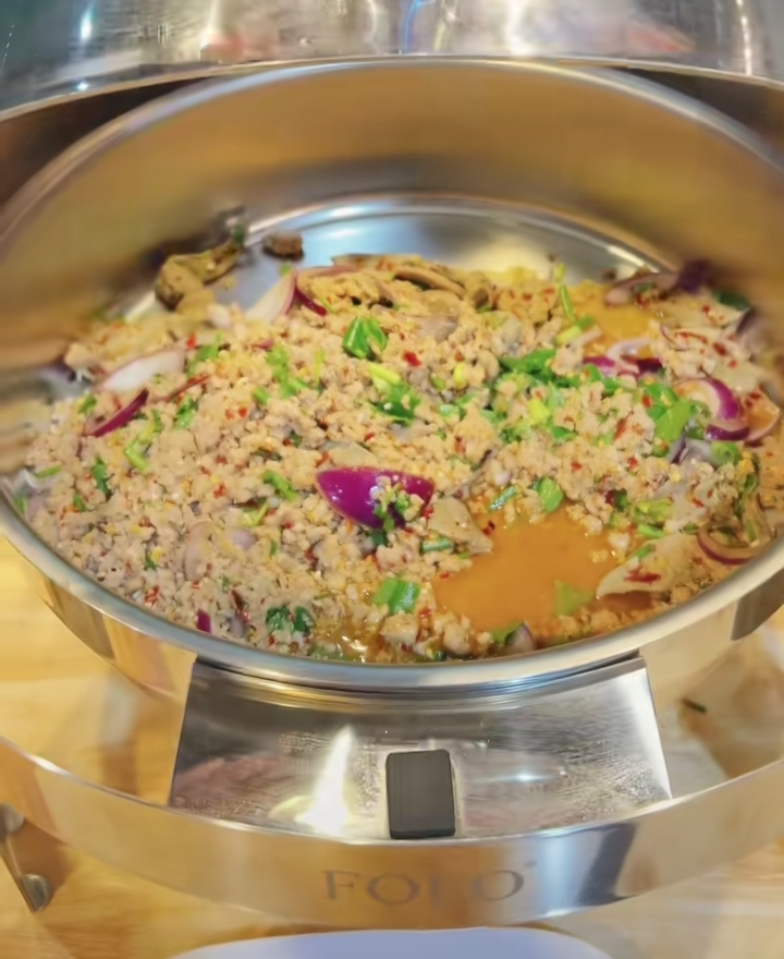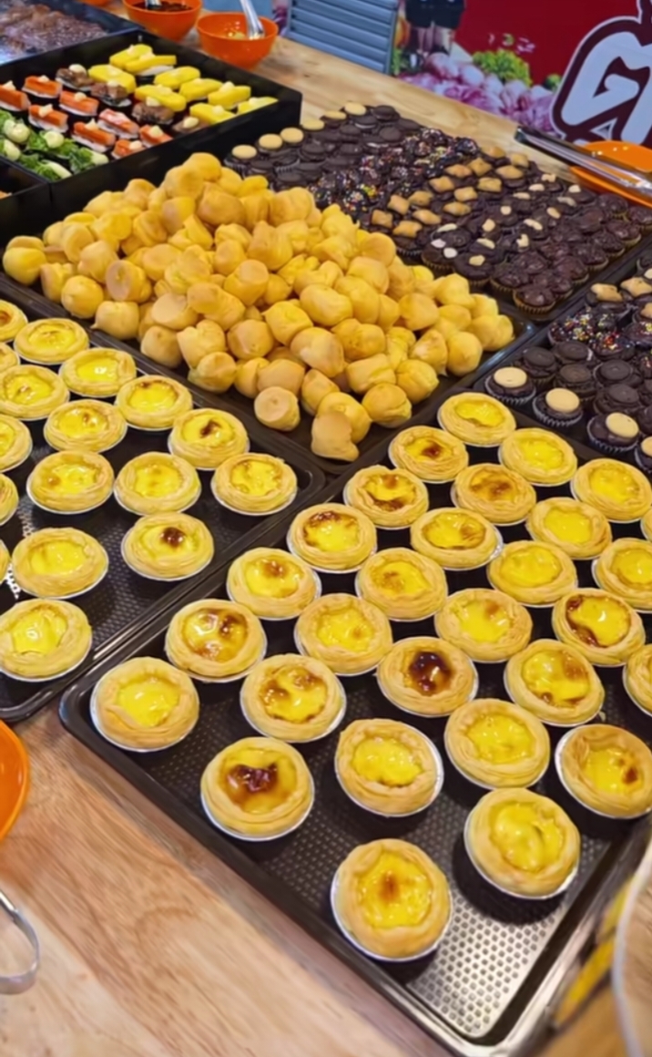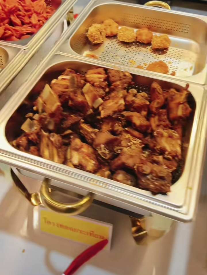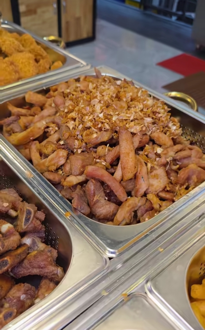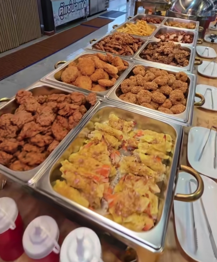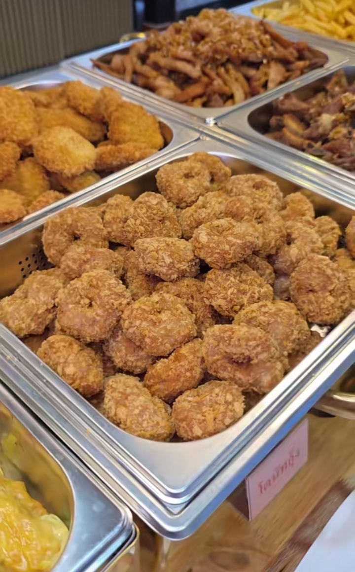 ไส้กรอกอีสาน โดนัทกุ้งเกี๊ยวกุ้ง เกี๊ยวหมู เกี๊ยวปูอัด นักเก็ตปลา นักเก็ตไก่ซี่โครงหมูกระดูกอ่อน หมูทอดกระเทียมหมูทอด กระเทียมพริกไทยดำ ไก่ผัดเม็ดมะม่วง ราคาหัวละ 200 แต่ร้านนี้รับคนละครึ่งด้วยเครื่องดื่ม refill ไม่อั้นรวมมาแล้วหมดทุกอย่างแถมมีเน็ต WiFi ให้เล่นฟรีได้อีกเป็นอะไรที่คุ้มมาก