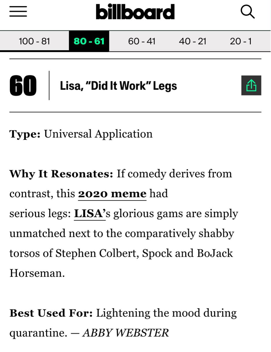 โดย Billboard ยกให้เป็น 1 ใน 100 มีม ดังตลอดกาล ลิซ่าอยู่อันดับ 60 ซึ่งมีมดังกล่าวมาจากคลิป LiLi’s FILM#3 - Lisa Dance Performance Video ของวันที่ 20 เม.ย.2020