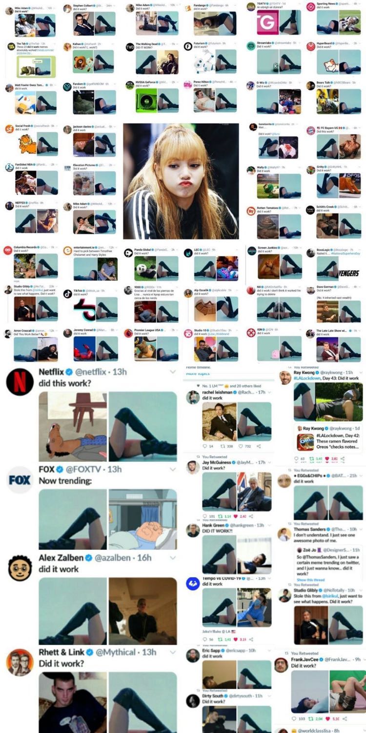 ผ่านมา 3-4 วันก็ยังปังไม่หยุด สำหรับเทรน "Did it Work" ทั้งเซเลปคนดังและทวิตแอคใหญ่ ทั่วโลก โดยเฉพาะฝั่งอเมริกา หลากหลายวงการ ต่างหันมาตัดต่อภาพคู่กับ เรียวขา ลิซ่า แบบไม่เคยเห็นป