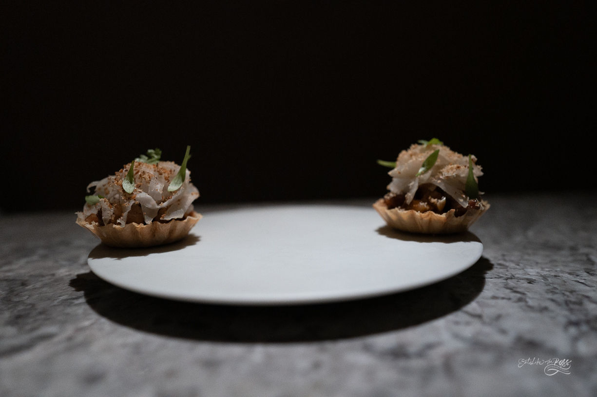 Tofu Skin Tart / Smoked Pig Head / Chayote Pickle / Spice Tamarind Sauce อีกหนึ่งคำที่ยอดเยี่ยม นี่คือการตีความ "โลบะ" ของว่างชื่อดังของภูเก็ต ที่มีรากฐานจากวัฒนธรรมมลายู-ฮกเกี้ยน ตัวทาร์ตทำจากฟองเต้าหู้ที่กรอบเบา แต่ไม่ร่วงแตกในมือ สอดไส้หัวหมูรมควันเครื่องพะโล้ กลิ่นควันนำมาแต่ไกลเมื่อเข้าปาก ซอสโลบะรสหวานนำเปรี้ยวตาม จากมะขามหวานและถั่วป่น โดยมียอดมะระดองมาช่วยตัดเลี่ยน เป็นคำที่มีเท็กซ์เจอร์หลากหลาย ทั้งกรอบเบาและหนึบหนับ เป็นคำที่ผมชอบมากๆครับ