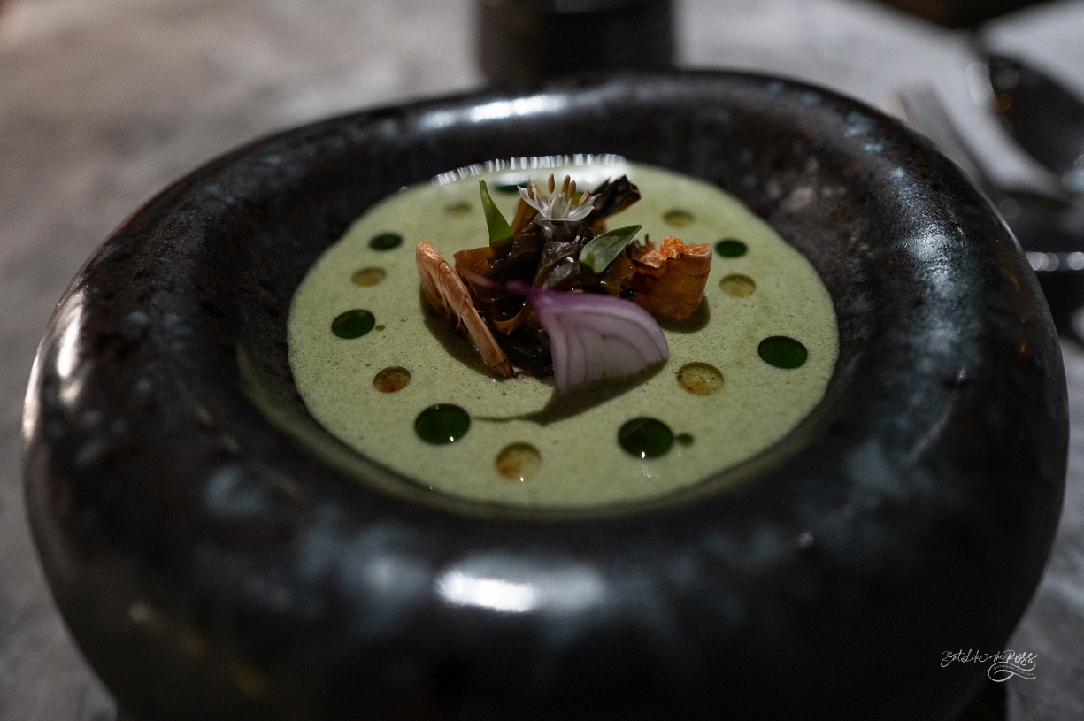 Ranong Thai Krill Shrimp Chawanmushi / Malindjo, Malindjo, Malindjo จานนี้คือความอุ่นท้องที่ทำได้ดีมาก เป็นการรวมสองสิ่งที่โด่งดังของภาคใต้คือต้มกะทิและใบเหลียง เสิร์ฟมาในรูปแบบไข่ตุ๋น (Chawanmushi) เนื้อเนียนนุ่มอุมามิ ที่มีเคยเค็มจากระนอง และกุ้งกรอบๆ ให้รสเค็มเป็นเบส ทานคู่กับซอสที่ทำจากผงใบเหลียงชงแบบมัทฉะผสมกะทิ ให้กลิ่นเขียวสดชื่น รสหวานมันแบบต้มกะทิ
