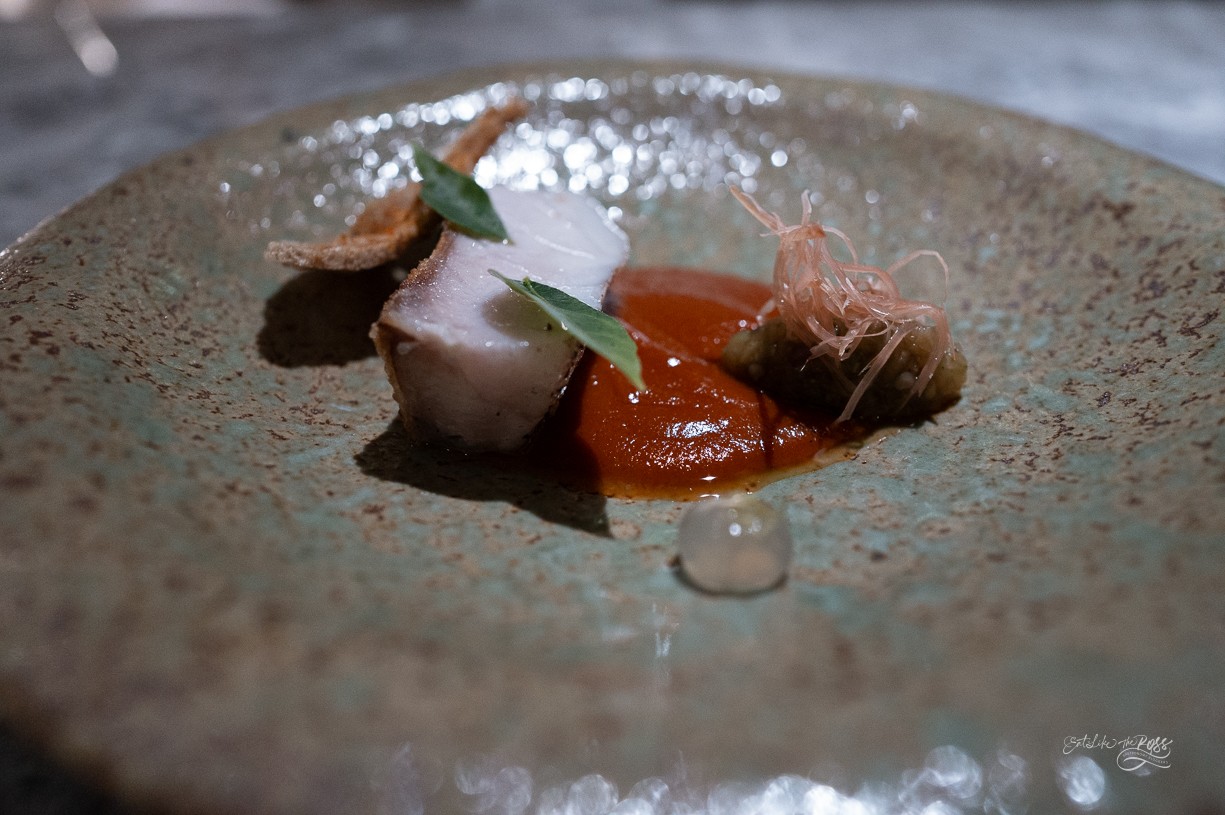 Catch of the Day / Tu Mae Sauce / Torch Ginger Kombucha Gel / Homemade Keropok จานนี้คือ "แกงตอแมะ" อาหารเด่นของสตูล ซึ่งเป็นแกงที่ข้นแม้จะไม่ได้ใส่กะทิ โดยความข้นมาจากเนื้อปลา เสิร์ฟกับปลาเกาะ (Grouper) ที่เนื้อหนึบเด้ง รสแกงไม่จัดจ้าน แต่ออกแนวอุมามิกลมกล่อมติดเปรี้ยวอ่อนๆ เพิ่มมิติด้วยเจลดาหลาและใบ