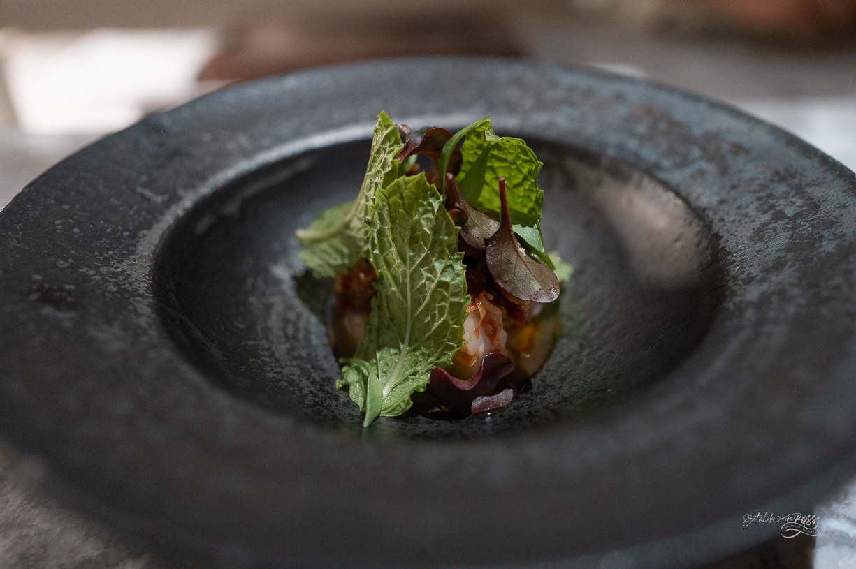 Nakhon Si Thammarat Crab / Tubtim Siam Pomelo / Crab Roe Emulsion จานนี้คือน้ำพริกไข่ปู ที่นำเสนอในรูปแบบโดนัท โดยมีไส้เป็นเนื้อปูทองหลา และปูชิ้นโตเนื้อแน่นที่หอมกลิ่นควัน ไส้ในอุ่นๆให้รสออกหวานนำไม่เผ็ดร้อนมากนักผิดจากภาพในหัว ที่คิดถึงรสเผ็ดร้อนจากพริกเหลืองแต่ก็ไม่ชัดเจนนัก ออนท็อปด้วยส้มโอทับทิมสยาม เพื่อเพิ่มมิติความสดชื่น