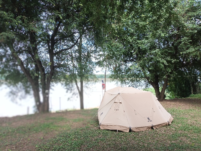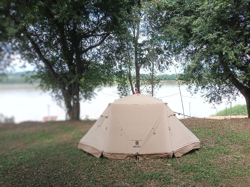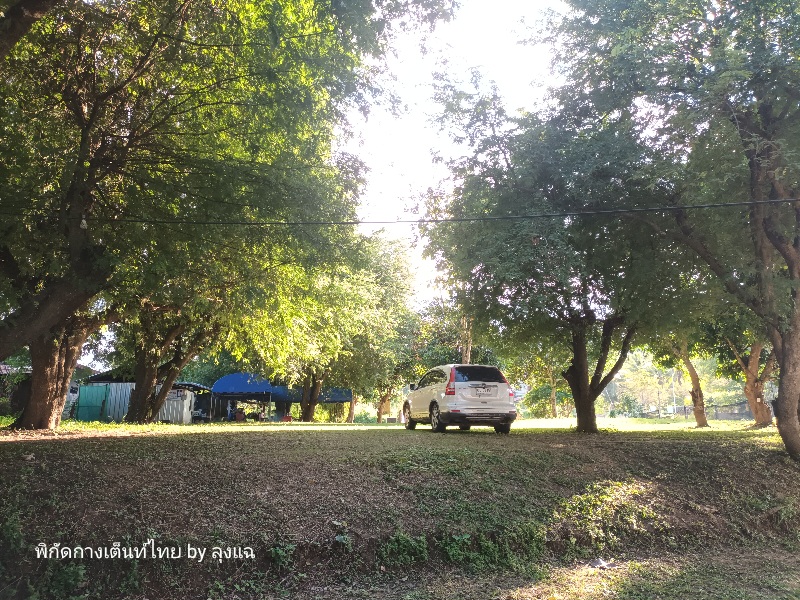 ขับรถลงมาจอดลานระดับ 2 เลือกกางจุดนี้ ที่จริงลานล่างสุด จะใกล้ชิดริมน้ำมากกว่า แต่ต้องขนของลงบันไดไปอีกหลายเมตร และยกของไปจุดที่เลือกอีก ซึ่งลำบากแน่