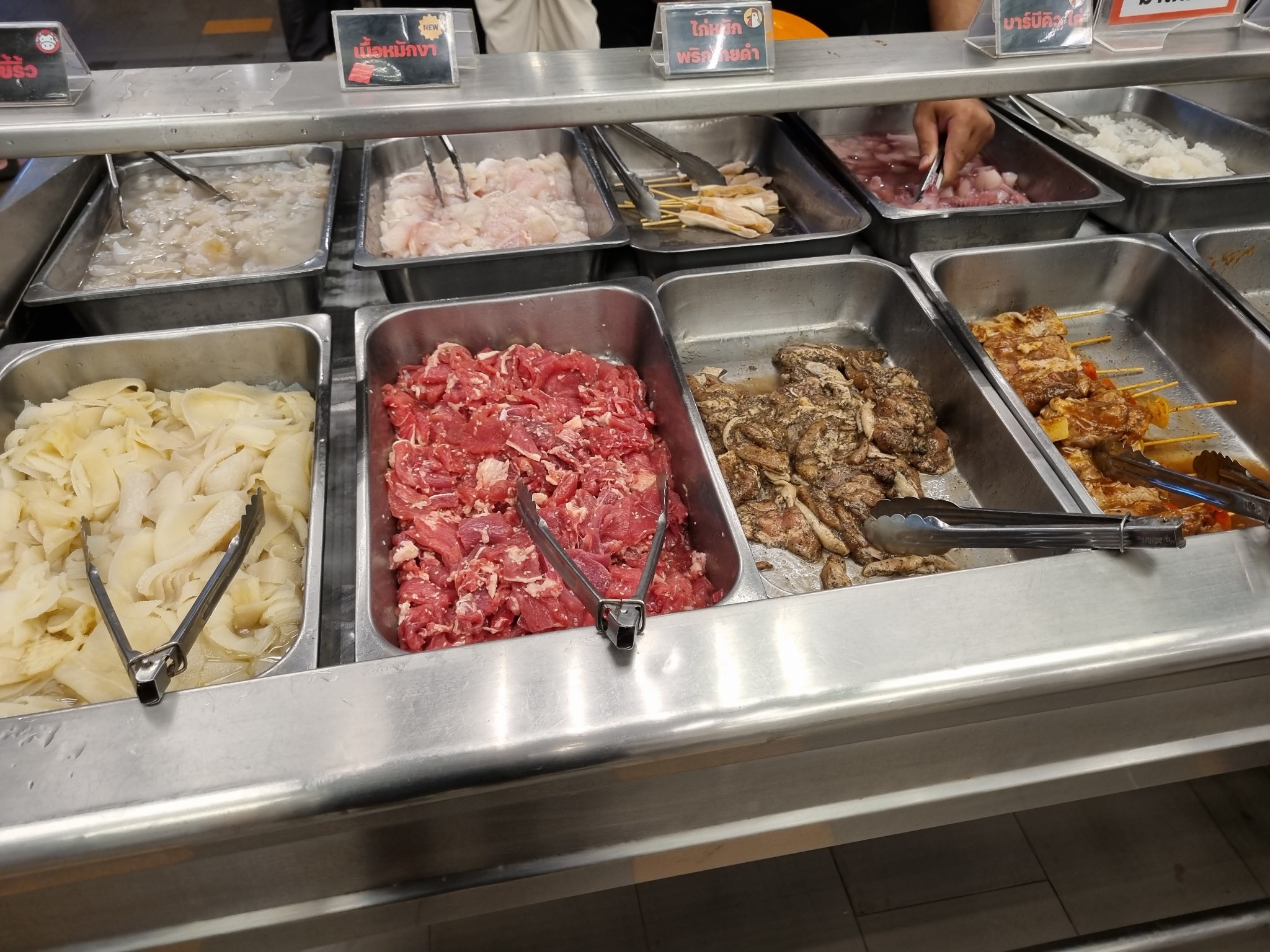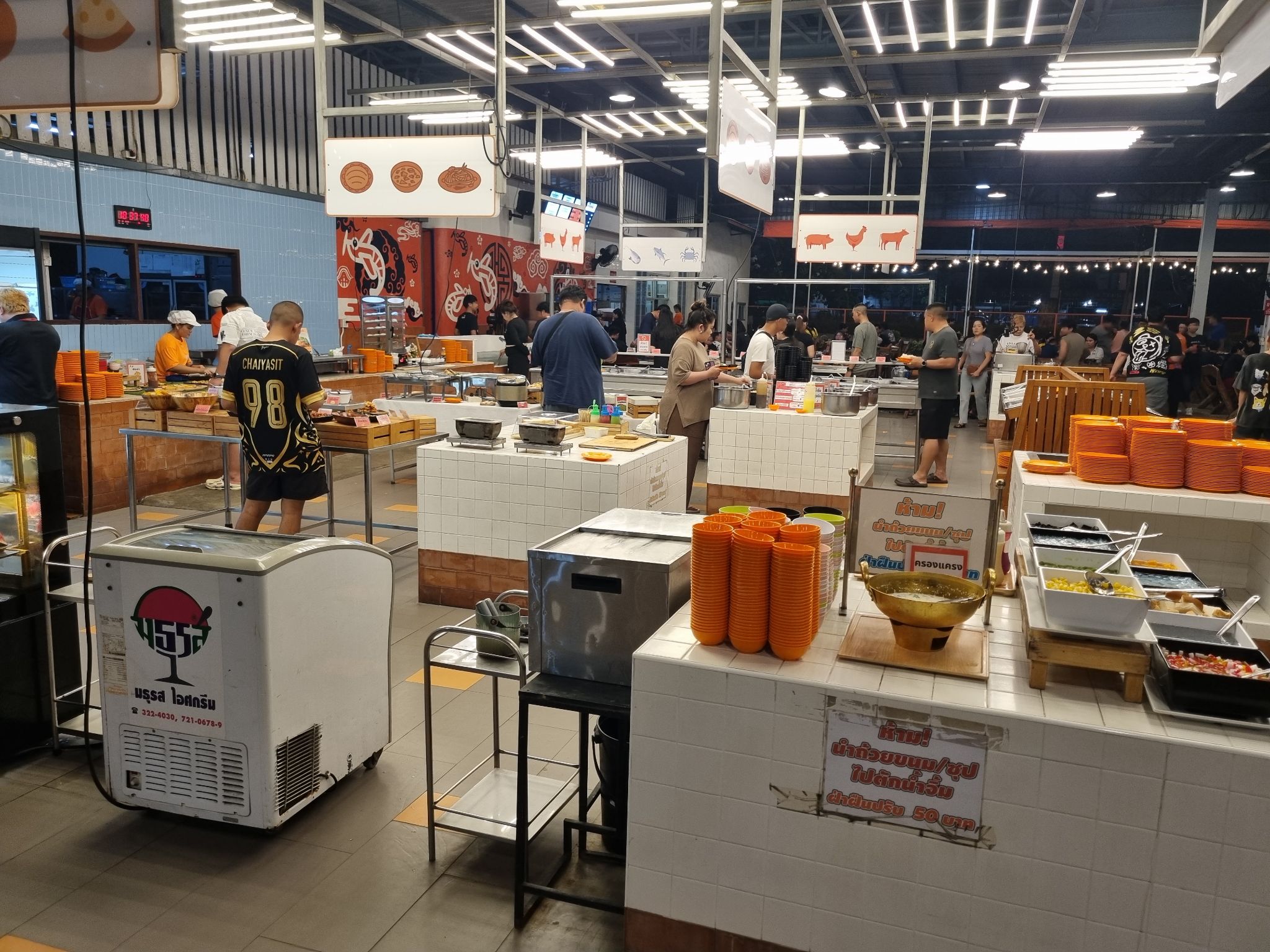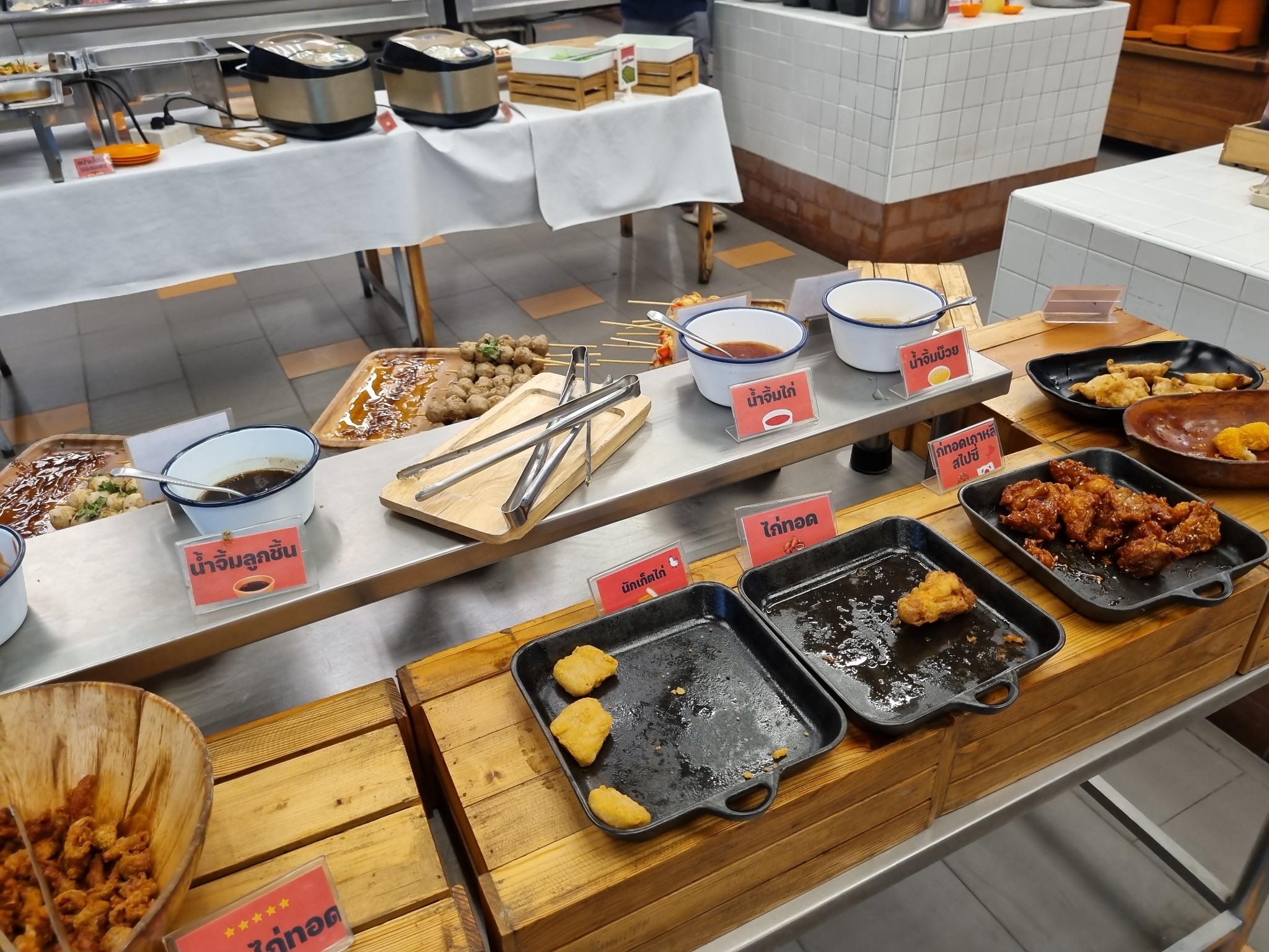 แม้ร้านจะใหญ่ แต่ก็แลดูอึดอัด เพราะคนมากินกันเยอะ สเตชั่นตักของมีหลายส่วน แต่ก็ติดชิดกันเกิน ตอนตักกันนี่หลังแทบจะครูดจะชนล้มกันอยู่แล้ว