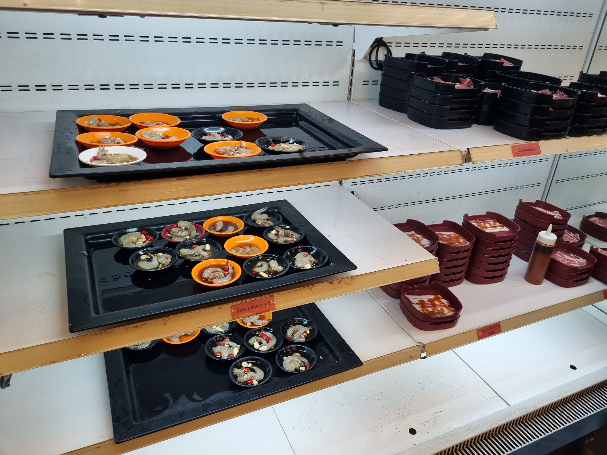 เริ่มจากตู้แช่เนื้อ ซึ่งจะเป็นพวกเนื้อสไลด์ และกุ้งดอง