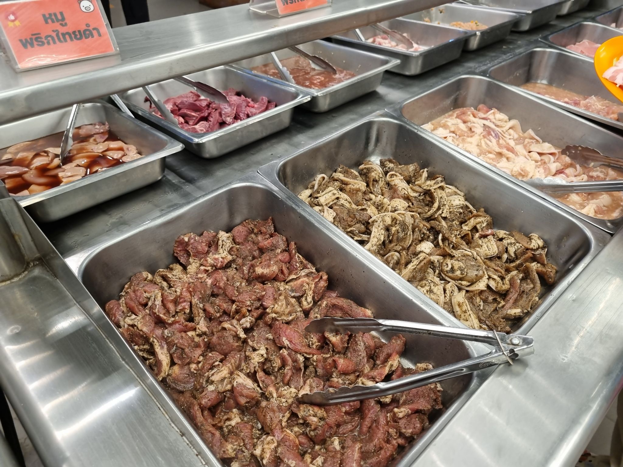เนื้อหมักชิ้นๆแบบหมูกะทะดั้งเดิมจะอยู่อีกฝั่ง ใกล้กับจุดตักของทะเล