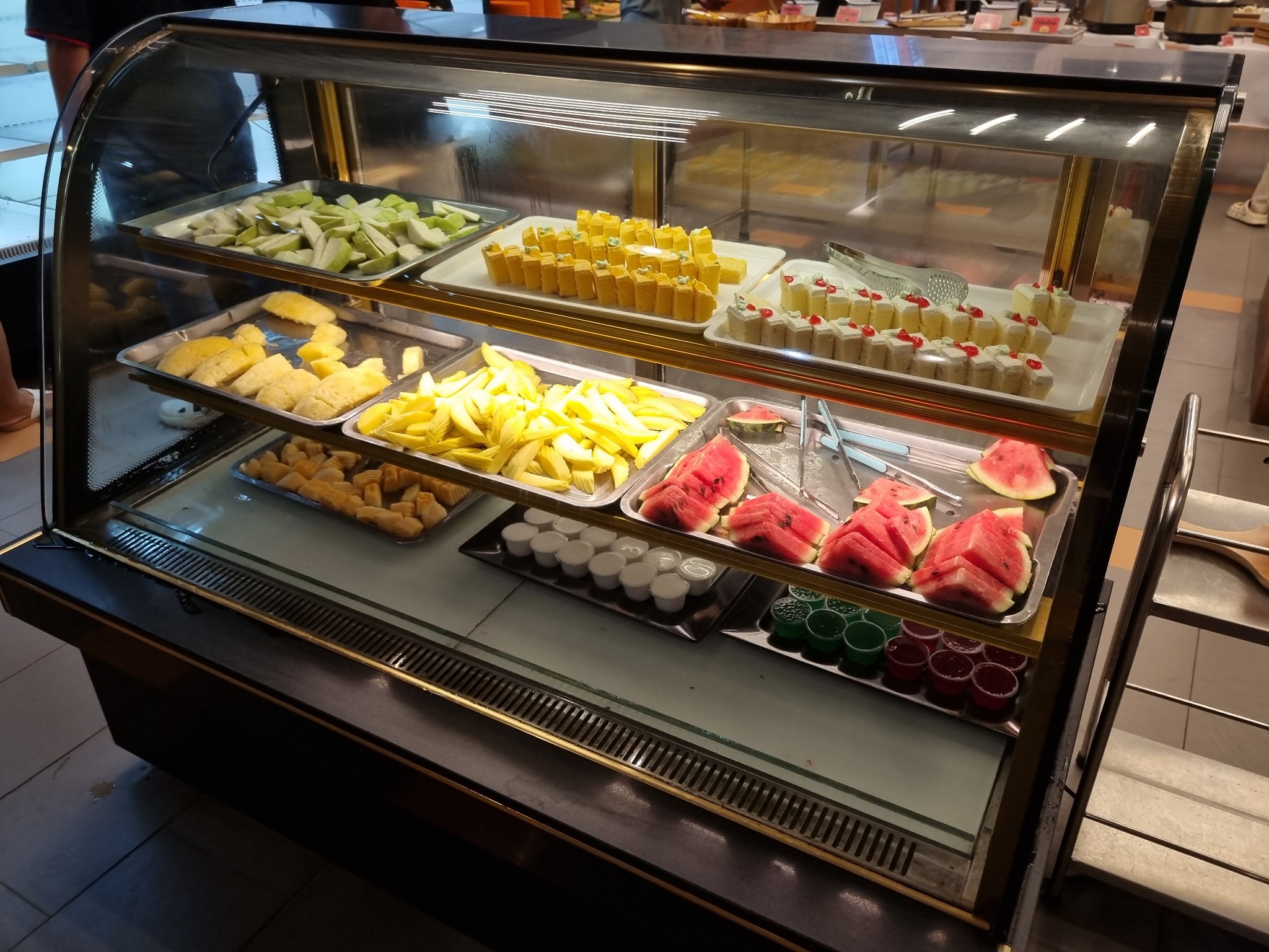 ใกล้ๆกับตู้แช่เนื้อจะเป็นตู้แช่ผลไม้ ขนมหวาน และหวานเย็นแบบ DIY ที่มีมาให้เสริมเติมแต่งกันอย่างจุใจ