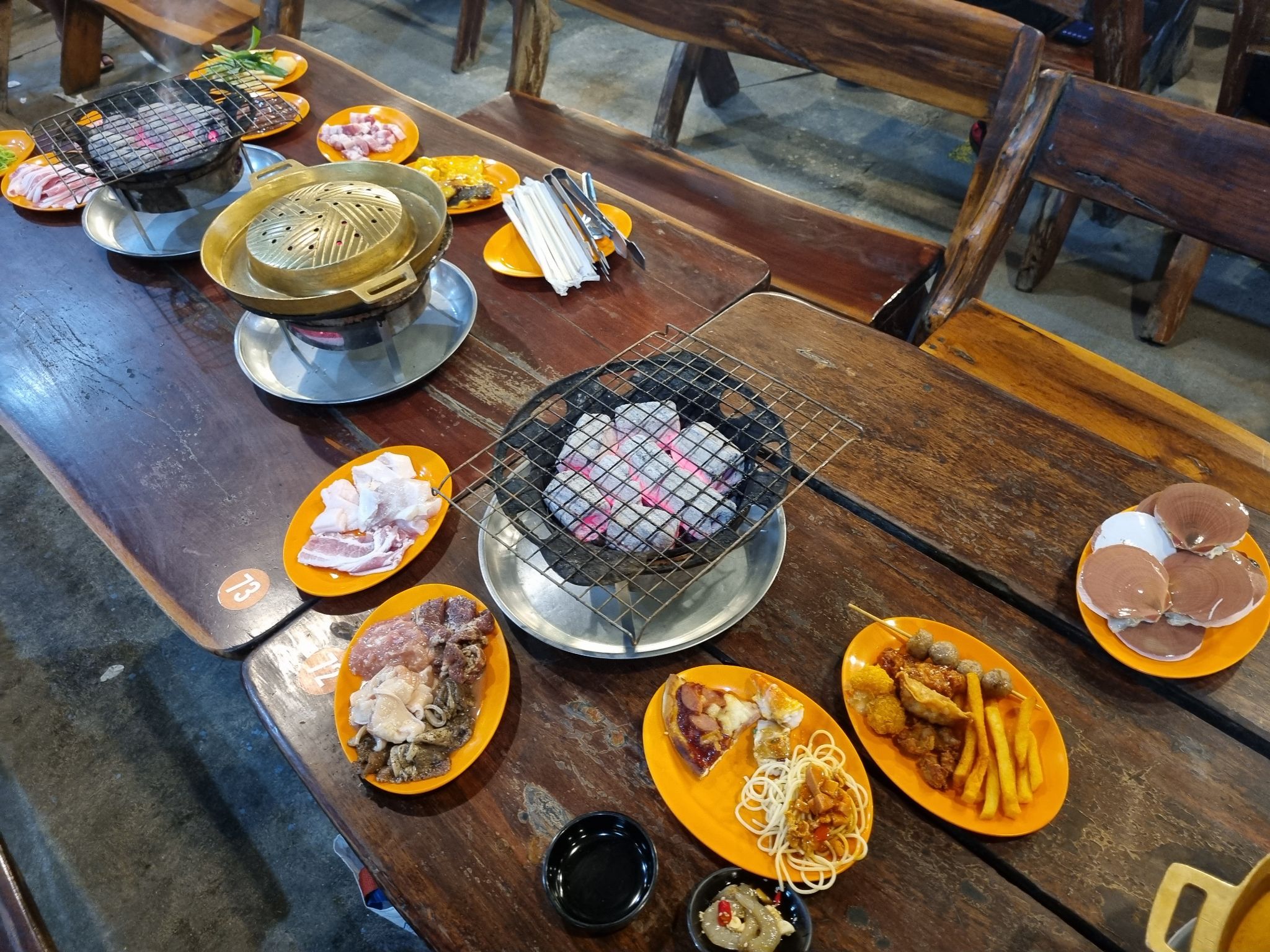 เป็นอีกหนึ่งร้านหมูกะทะที่แทบจะครบเครื่องในด้านของความหลากหลายเลย โดยเฉพาะของหวานและของกินเล่น มีให้เลือกเยอะและเวียนกันมา