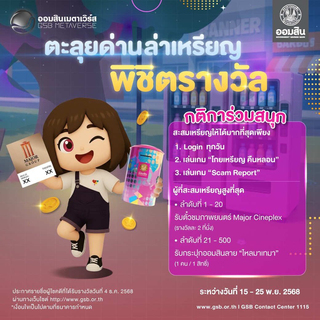 ไม่ว่าจะอยู่ที่ไหน ก็สนุกกับ ออมสินเมตาเวิร์ส ได้! ✨ เตรียมตัวให้พร้อม แล้วมาทำภารกิจสุดมันส์ในโลกเสมือนจริง เพื่อชิงรางวัลรวม 500 รางวัล!