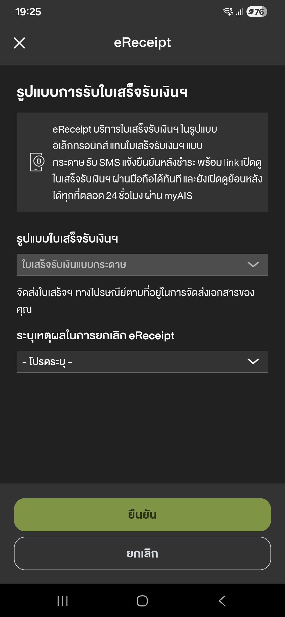 เราต้องการเปลี่ยนจากการรับใบเสร็จรับเงินแบบกระดาษให้รับเป็น eReceipt ค่ะ แต่เรากดเปลี่ยนในแอป MY AIS ไม่ได้ เหมือนระบบมันล็อกไว้