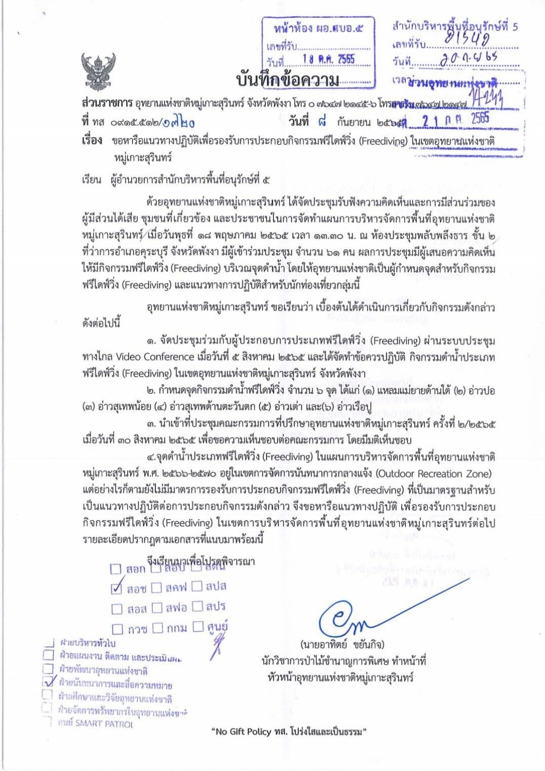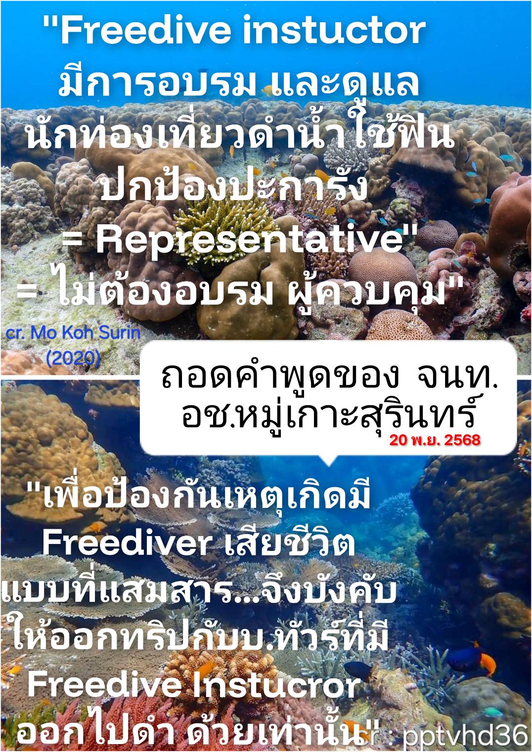 - เกี่ยวตรงที่ว่า ทางอช.หมู่เกาะสุรินทร์ ให้ ทำกิจกรรม Freediving กับ Freediving Instuctor ป้องกันการเกิดอุบัติเหตุ