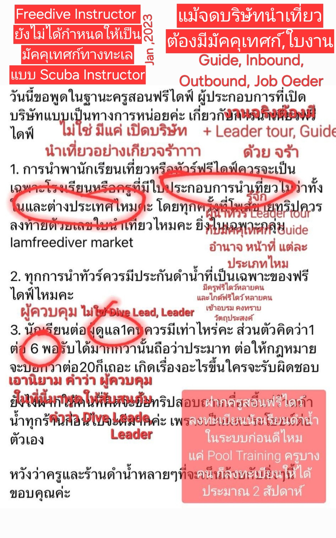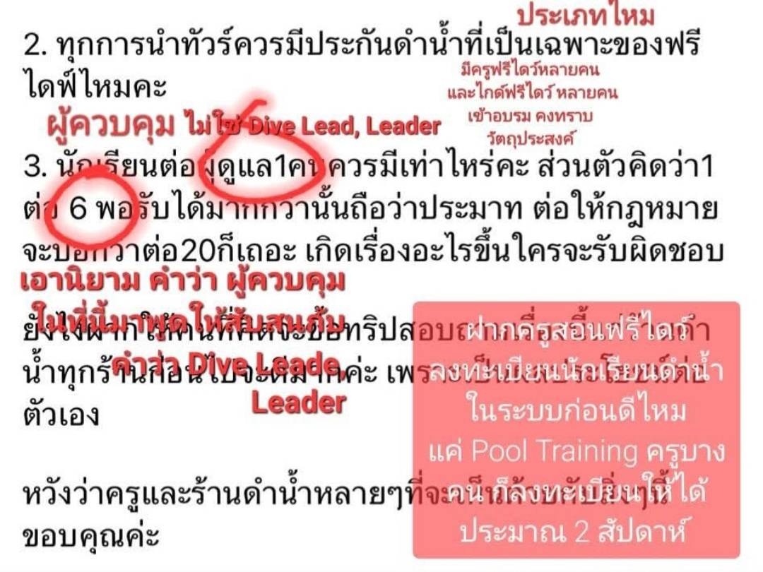 - ส่วนเรื่องปัญหา Lead ที่ครู Freedive Instucor เห็นว่า มีไม่พอรองรับกับ นักท่องเที่ยว และ ผู้ประกอบการ... จะมีทางออกใดบ้าง