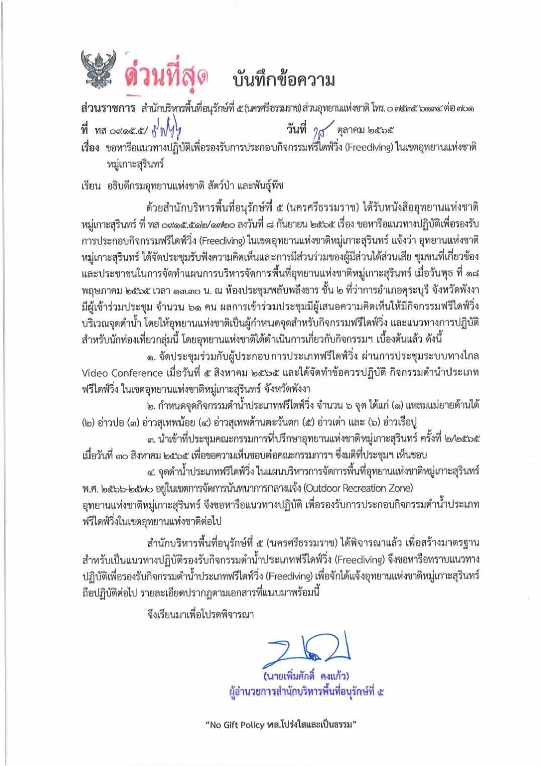 - ต้องการให้ Freedivers ทุกท่าน เข้าใจ หน้าที่ของความรับผิดชอบ ของ อช. หมู่เกาะสุรินทร์ ต้องเป็น บุคคลแรก ที่ต้องรับผิดชอบ หากเกิดความสูญเสีย มาตรการต่าง ๆ ที่กำหนดคือ คือ การเริ่มเรียนรู้ กิจกรรม Freedive