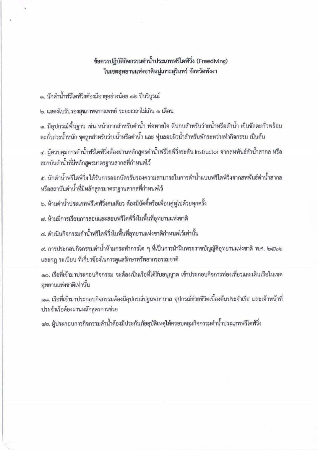 - ที่มาของ ปี 2566 ที่ ทางอช. หมู่เกาะสุรินทร์ ขอให้ คนที่จะ ทำกิจกรรม Freediving ต้องมีใบรับรองแพทย์ เนื่องจาก เคยมีนักท่องเที่ยวเสียชีวิต จากการทำกิจกรรมน้ำตื้น ไม่สวมเสื้อชูชีพ (จากที่รับข้อมูลมา)