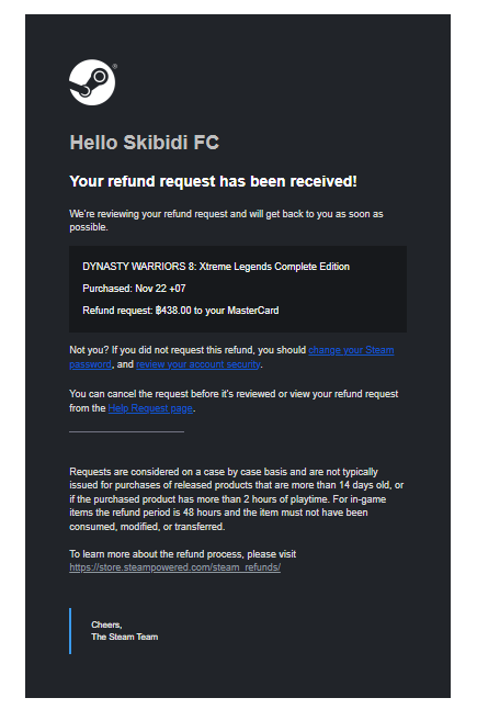 Your purchase has been refunded by Steam. We’ve issued the refund to the payment provider. You should see a&n