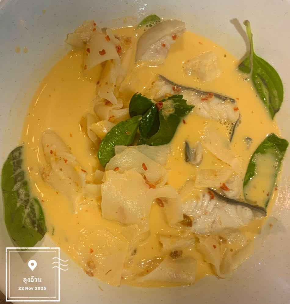 แกงคั่วกะทิหน่อไม้ดองเนื้อปลาคังใส่ใบโหระพาใบมะกรูด อร่อยมาก