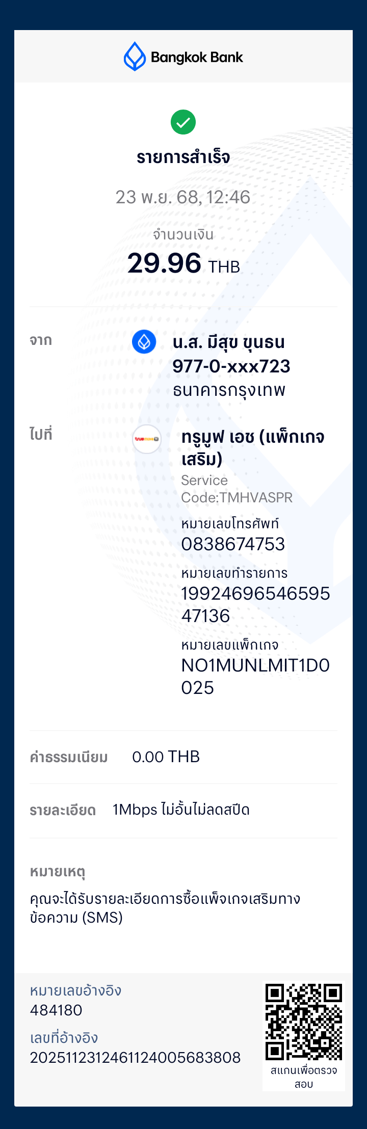 วันนี้เวลาเมื่อเวลา 12:46 น. ดิฉันได้สมัครแพ็กเกจอินเทอร์เน็ตแบบรายวัน ผ่านแอป ธนาคารกรุงเทพ