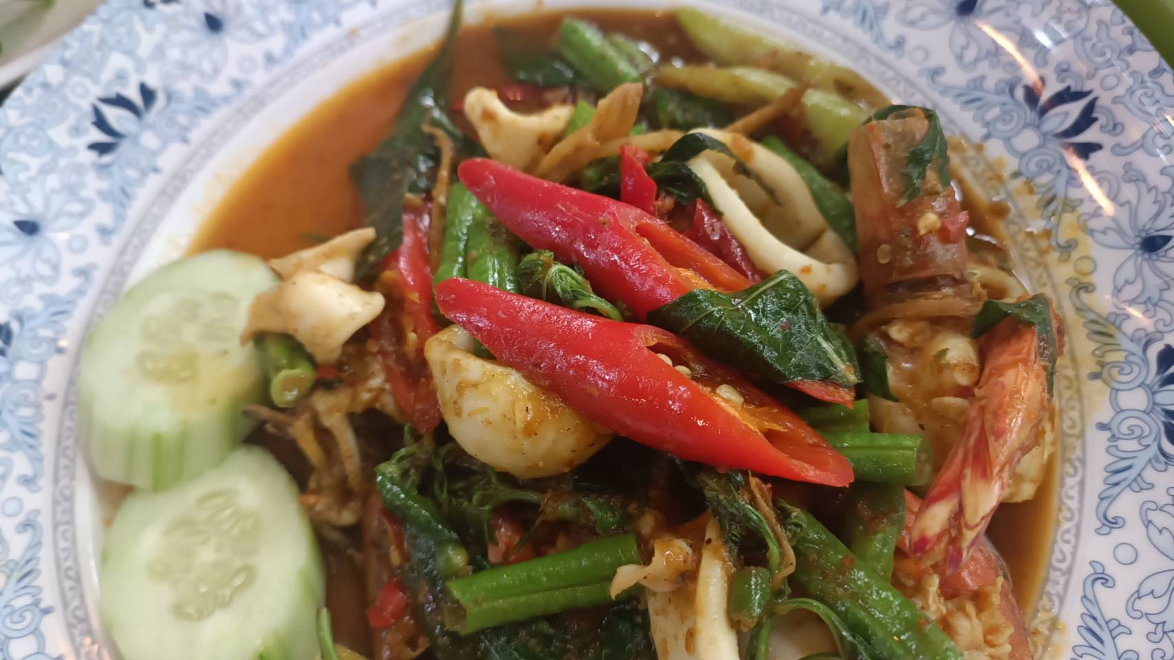 - ผัดฉ่าทะเลรวม อันนี้เครื่องจัดเต็ม แต่เราว่ากุ้งยังไม่สดเท่าไหร่
