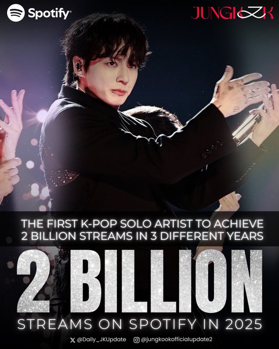 จองกุก ได้ทำสถิติยอดสตรีมเกิน 2 พันล้านครั้ง ใน Spotify ในปี 2025 เป็นที่เรียบร้อยแล้ว ทำให้เขากลายเป็น ศิลปินเดี่ยว K-pop คนแรกและคนเดียว ที่สามารถทำสถิตินี้ได้ถึง 3 ปีปฏิทินที่แตกต่างกัน
