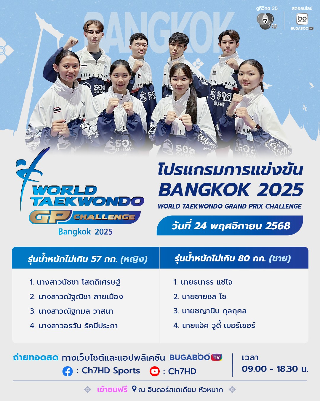 🥋แฟนเทควันโดห้ามพลาด ‼ BUGABOO.TV ชวนรับชมการถ่ายทอดสดการแข่งขันเทควันโดรายการ Bangkok 2025 World Taekwondo Grand Prix Challenge🏆 . 🗓️ระหว่างวันที่ 21-24 พฤศจิกายน 2568 CR: FB.Ch7HD