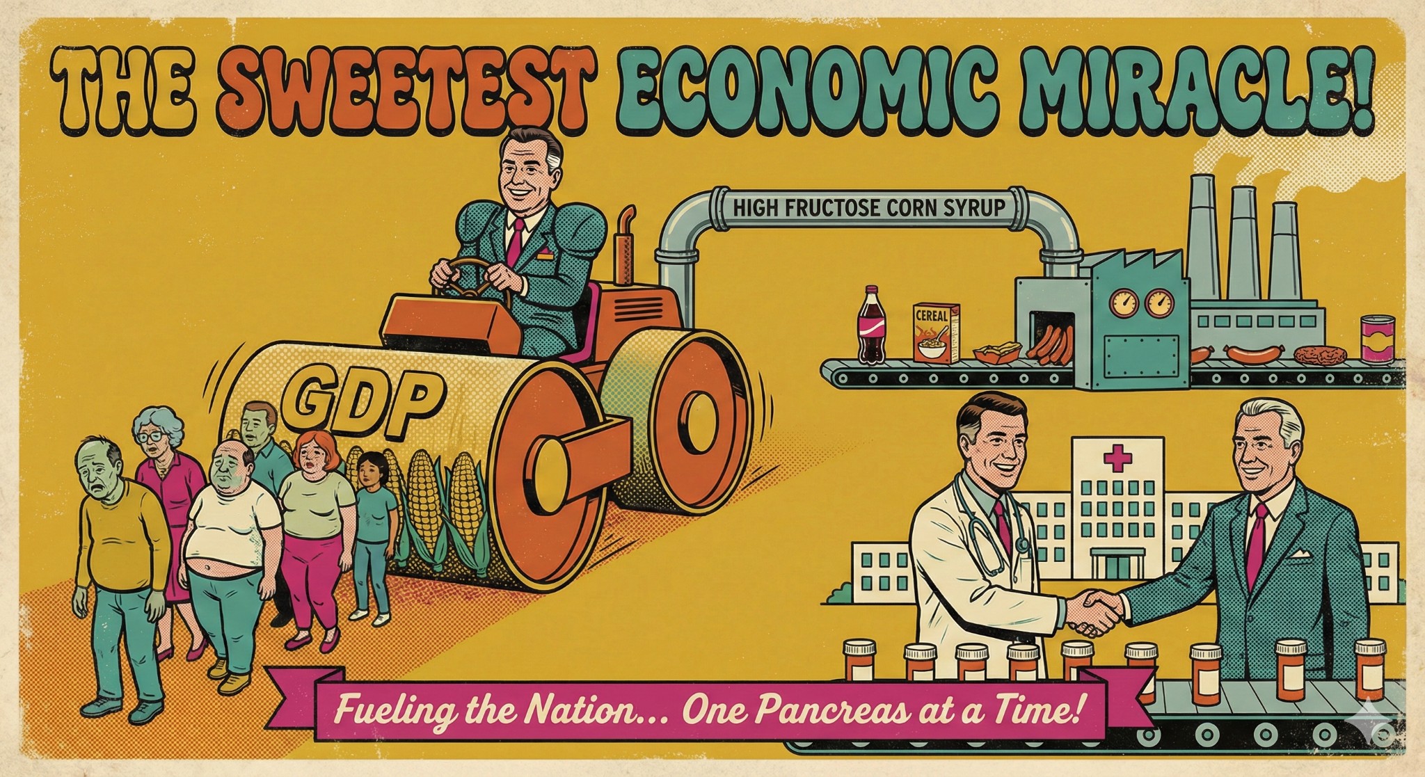 ปลูกข้าวโพดล้น > แปรรูปเป็นน้ำตาลถูก > ยัดใส่อาหาร > กดราคาอาหารไม่ให้เฟ้อ > คนกินป่วย > ซื้อยา/หาหมอ > เงินสะพัด! 💸
