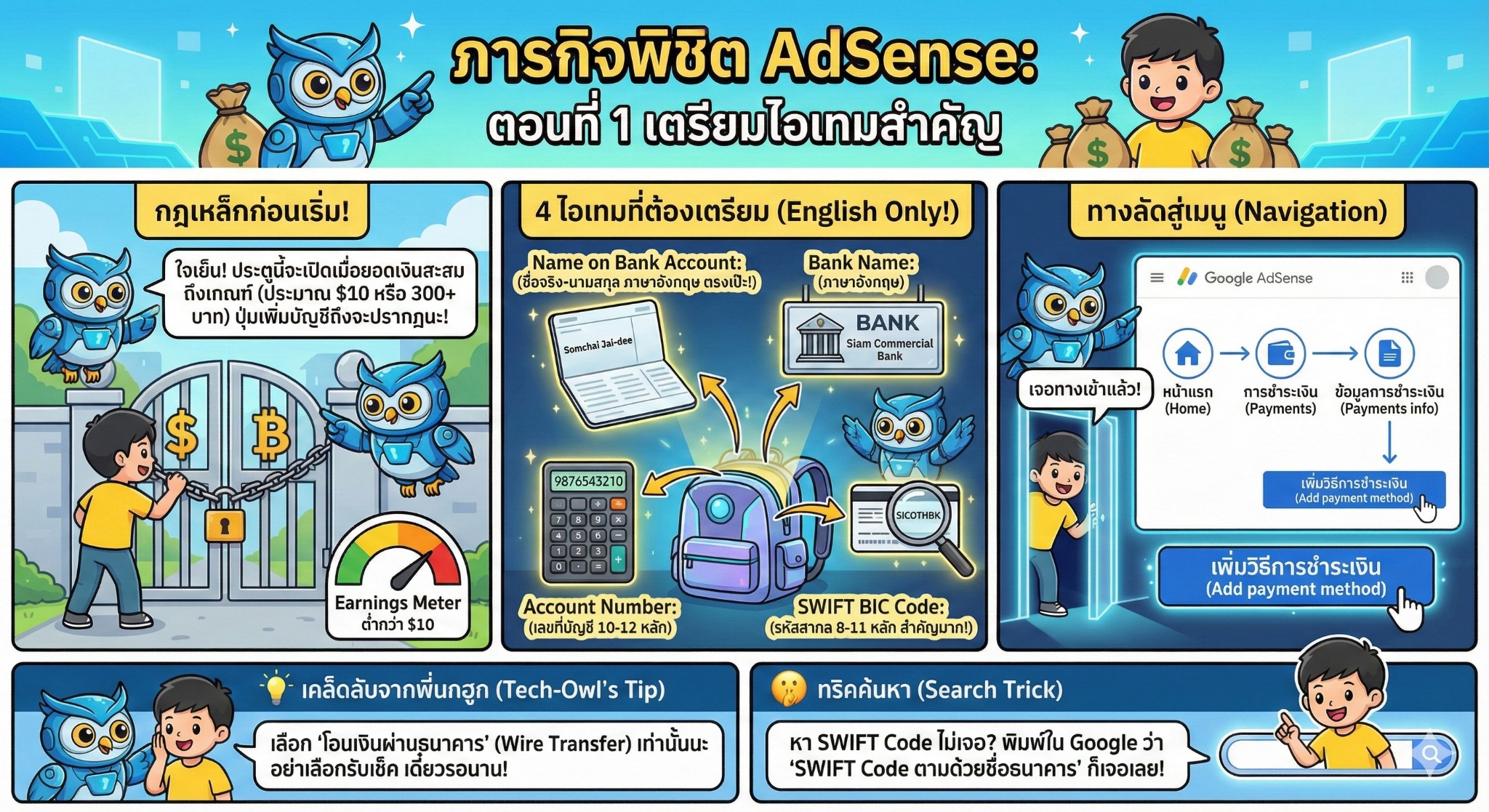 อยากสอบถามเกี่ยวกับการกรอกรายละเอียดการชำระเงินของ google adsense ครับ รหัสชำระเงินต้องกรอกมั้ยครับ และ Swift BIC ต้องกรอกยังไงครับ บัญชีธนาคารกรุงเทพครับ ขอบคุณครับ