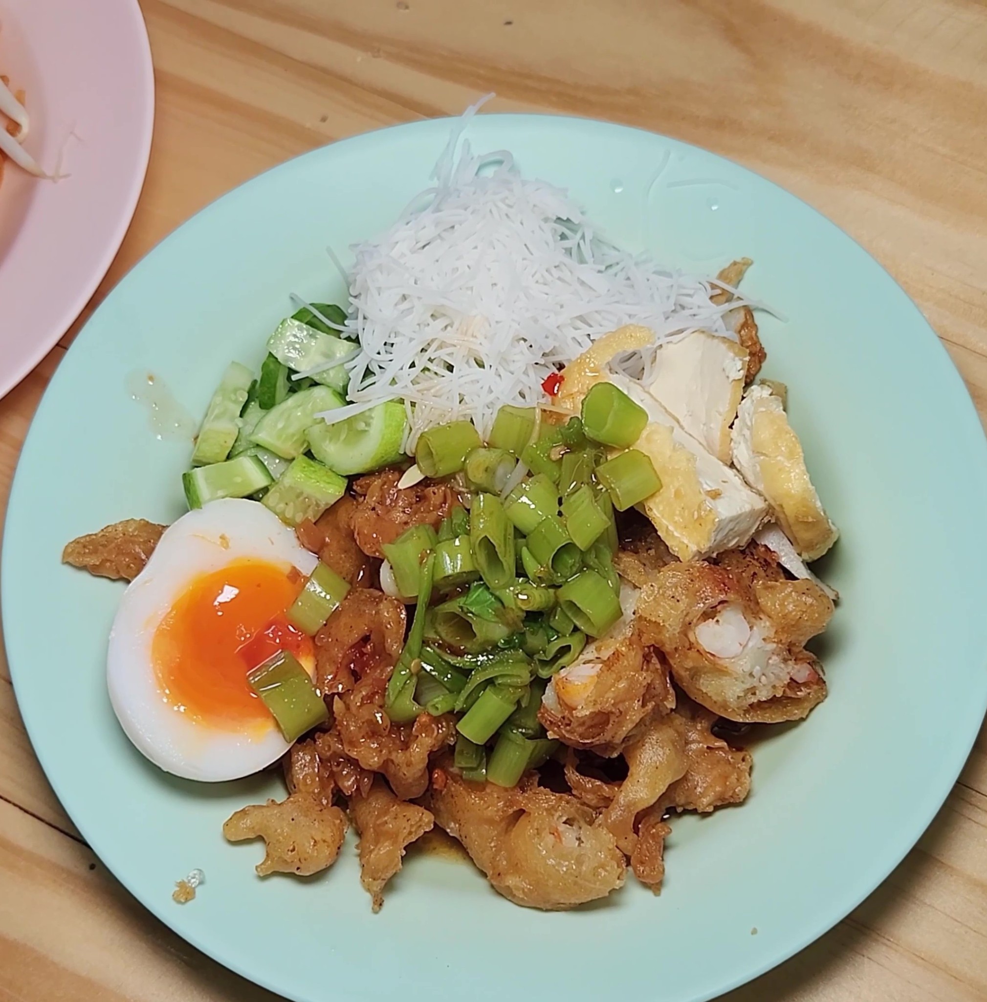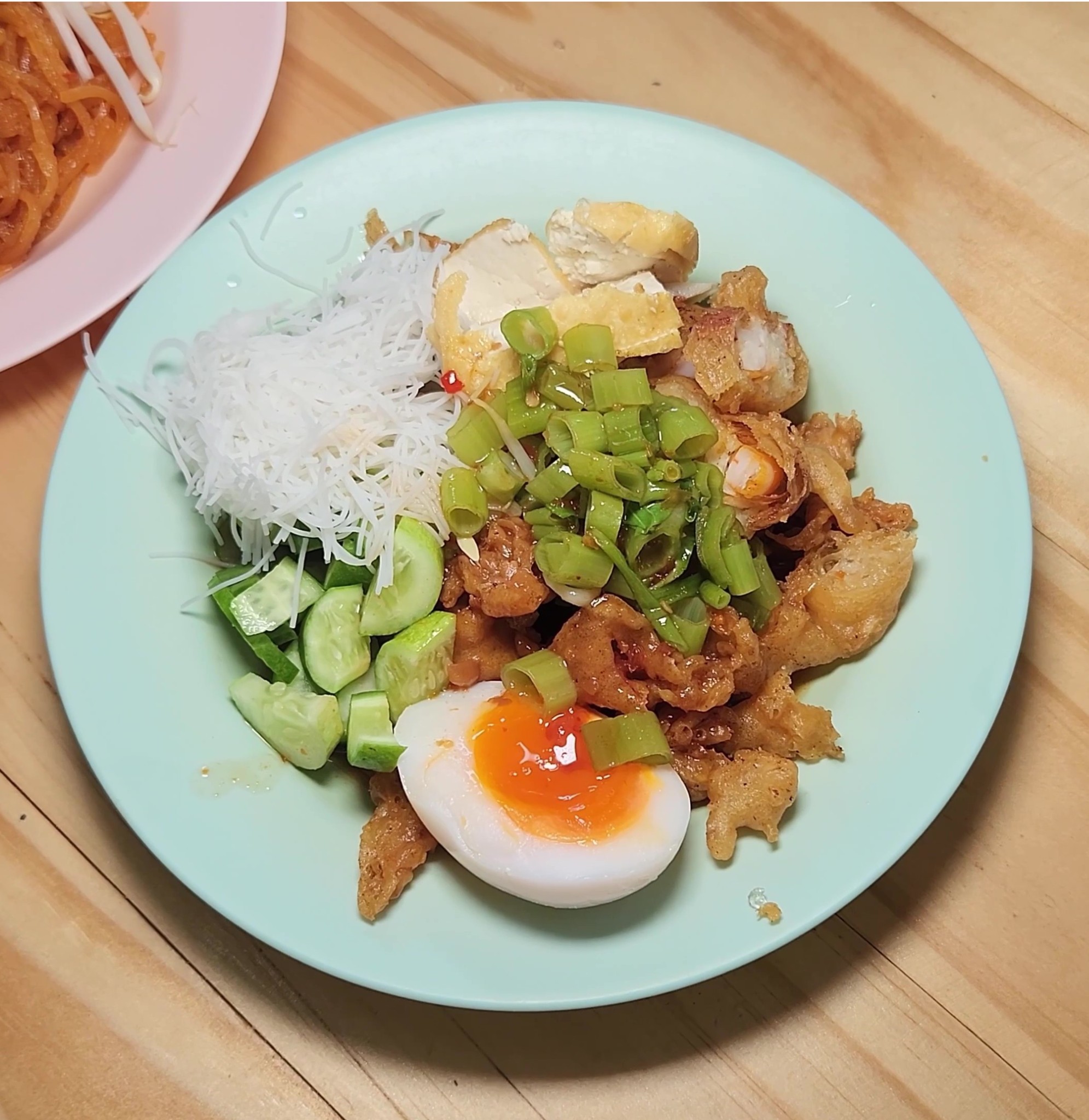 เต้าคั่ว กุ้งทอดกรอบ ใส่เต้าหู้ หมี่ขาว ราดน้ำจิ้มหวานอมเปรี้ยว กินคู่ผักบุ้ง แตงกวา
