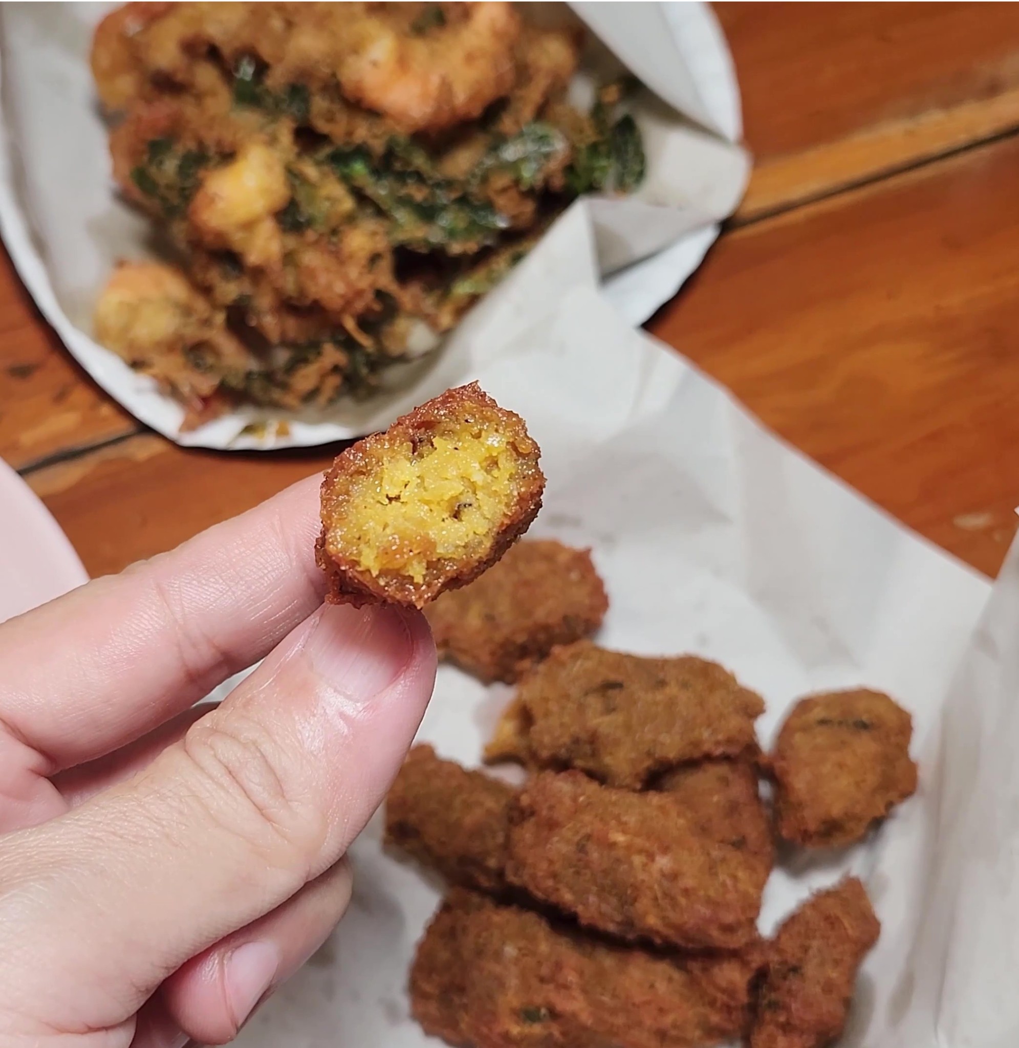 ลูกเห็ด หรือทอดมันทอด 40 บ. หอมเครื่องแกงใต้ใส่ขมิ้น มีมะพร้าวขูดหวานมันนิดๆ เย็นแล้วก็ยังอร่อย