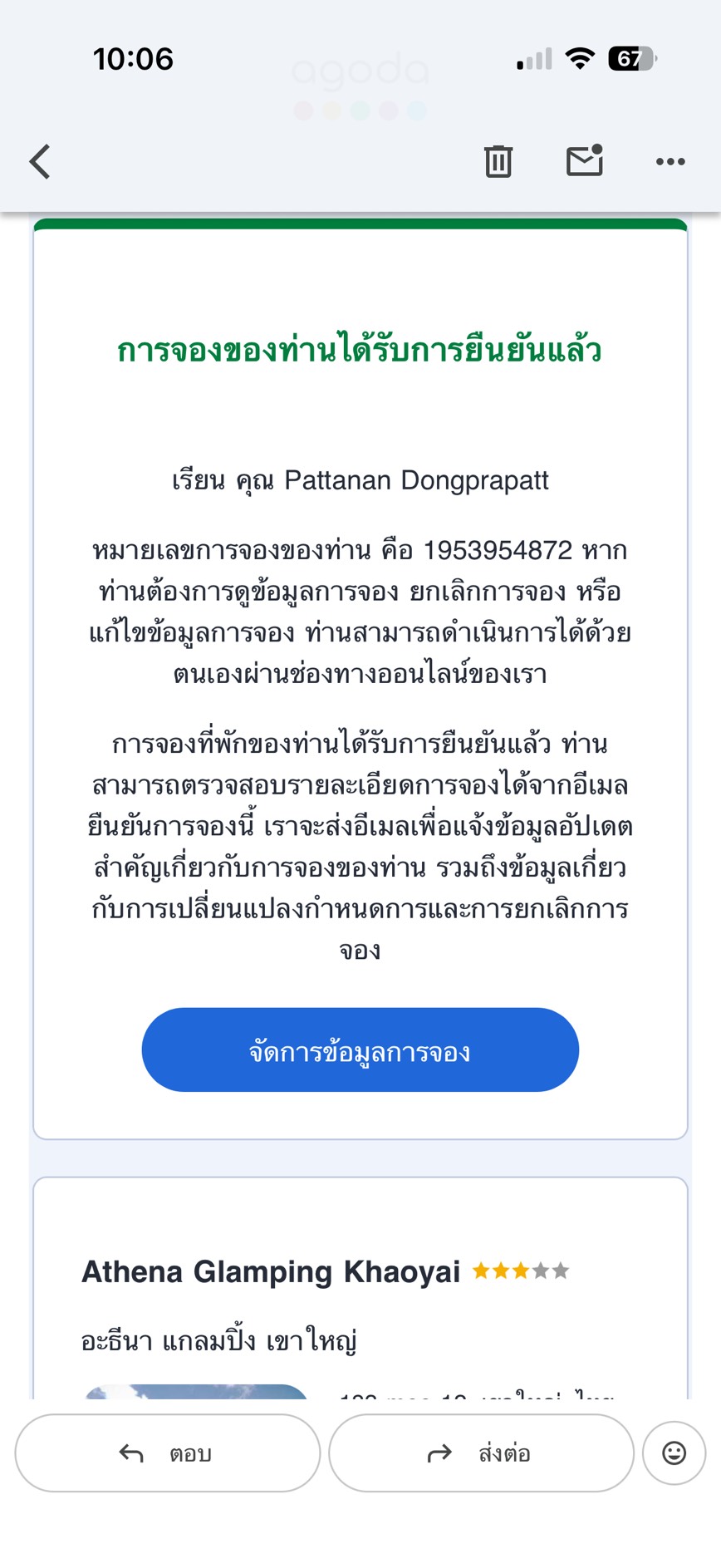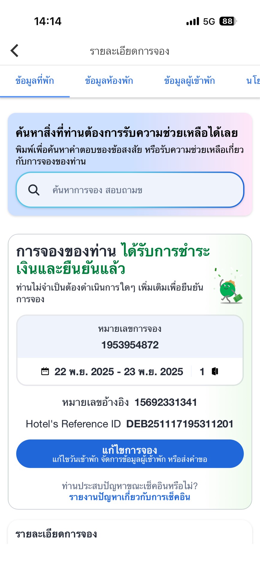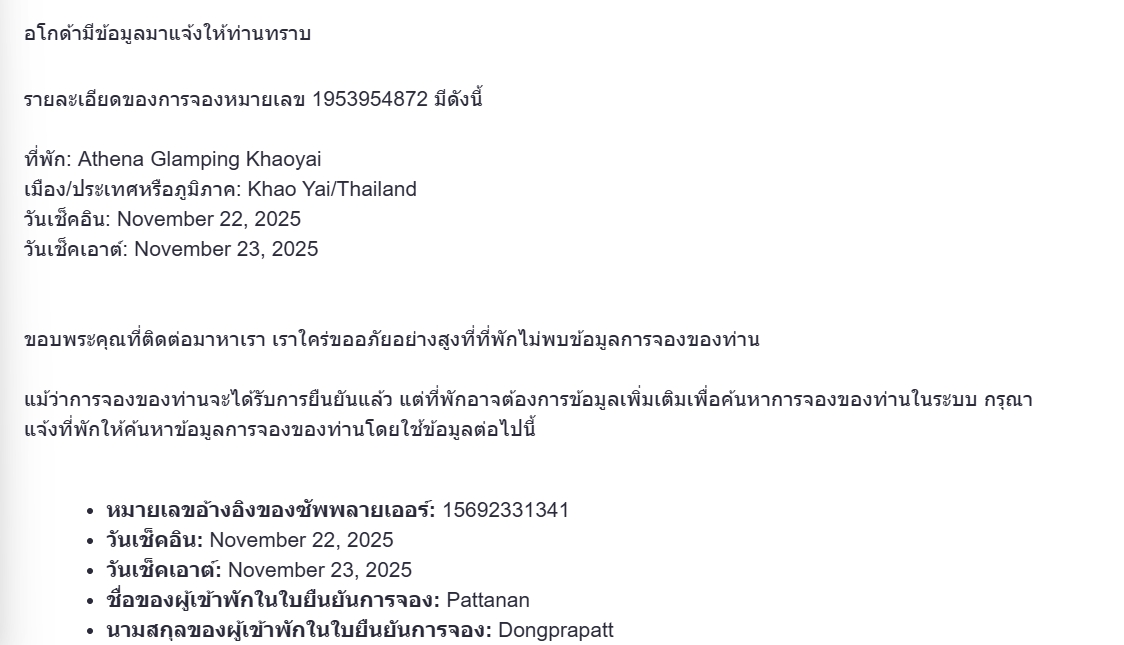 ได้ทำการจองที่พักที่เขาใหญ่ วันที่ 22 พย 68 เป็นจำนวน 1 คืน ได้ทำการตัดบัตรเครดิตเรียบร้อยและมีสถานะการยืนยันการจอง การตัดเงิน และส่ง Email มายืนยันทุกอย่างเรียบร้อย (อันนี้พาร์ทของเราที่จองผ่านเว็ปไซด์และมีหลักฐานครบ)