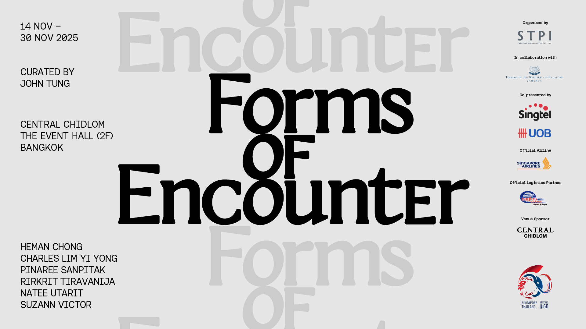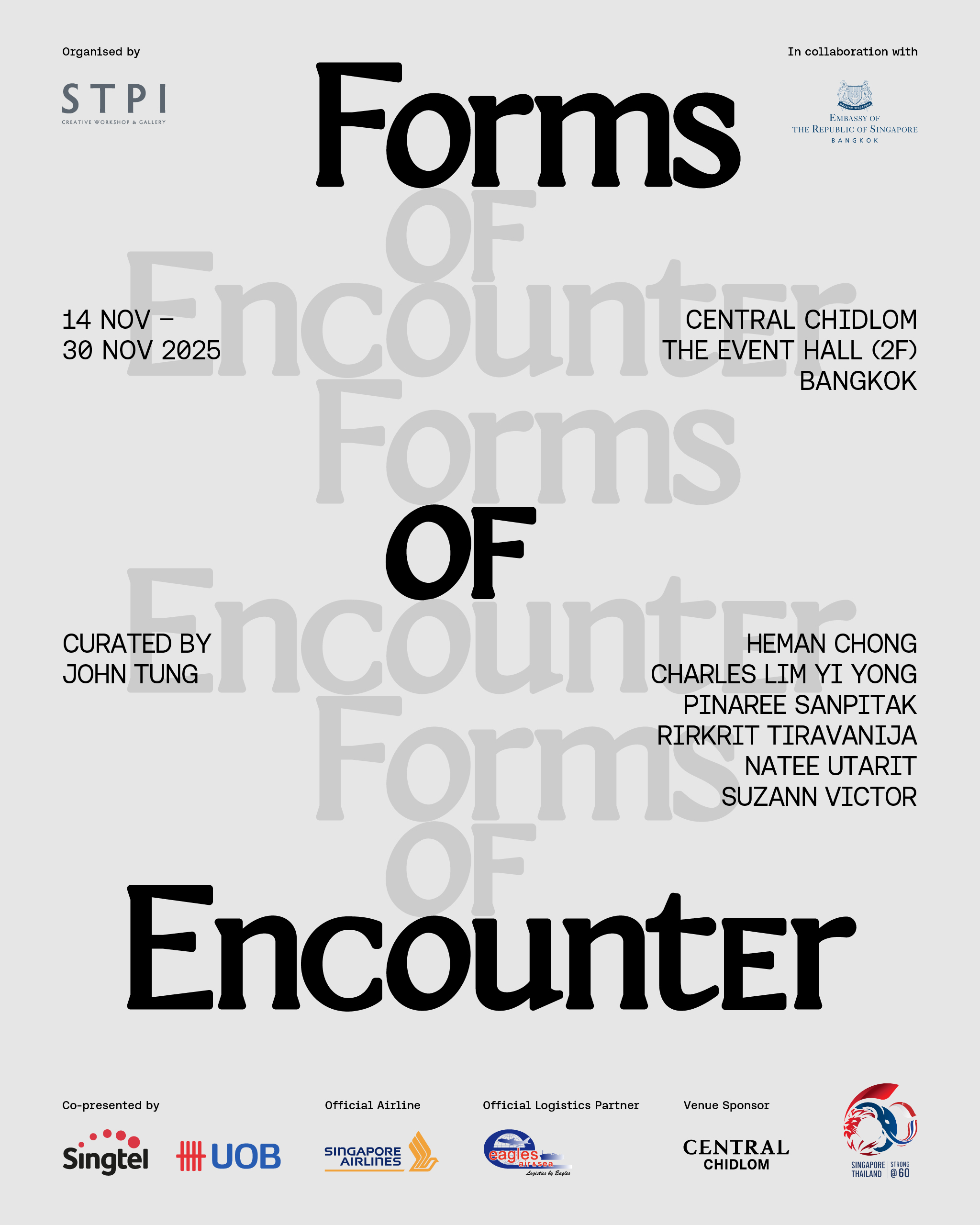 กรุงเทพฯ, 18 พฤศจิกายน 2025: นิทรรศการ Forms of Encounter (รูปรอยที่ได้พบเจอ) จัดแสดงโดย STPI ศูนย์ศิลปะร่วมสมัยด้านศิลปะงานภาพพิมพ์และงานกระดาษของประเทศสิงคโปร์ จัดขึ้นร่วมกับสถานเอกอัครราชทูตสิงคโปร์ประจำประเทศไทย พร้อมกับความร่วมมือจากธนาคารยูโอบี ประเทศไทย และ Singtel Group ได้เปิดอย่างเป็นทางการเนื่องในโอกาสครบรอบ 60 ปีความสัมพันธ์ทางการทูตระหว่างสิงคโปร์และประเทศไทย
