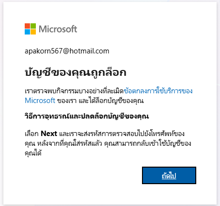 เเล้วมันก็ขึ้นเเบบนี้ มีครั้งนึงมันเด้งsmsมาเเล้วผมก็กรอกเข้าไป มันขึ้นว่าบัญชีปลดล็อคเเล้ว เเต่ผมก็ยังเข้าใช้งานmailไม่ได้ คือขึ้นเเบบเดิมเลยให้กรอกเบอร์ อะไรใหม่หมด คือตอนนี้ผมลองทำที่microsoftเเนะนำเเล้ว มีเปลี่ยนระหัสผ่านmailใหม่ เเละก็กรอกเเบบหฟรอมการขอกู้คืนmail มันบอกให้รอ1สัปดาห์ เเต่ตอนนี้เลยมาเเล้ว ก็ยังไม่มีmailจากmicrosoftส่งมาเลย
