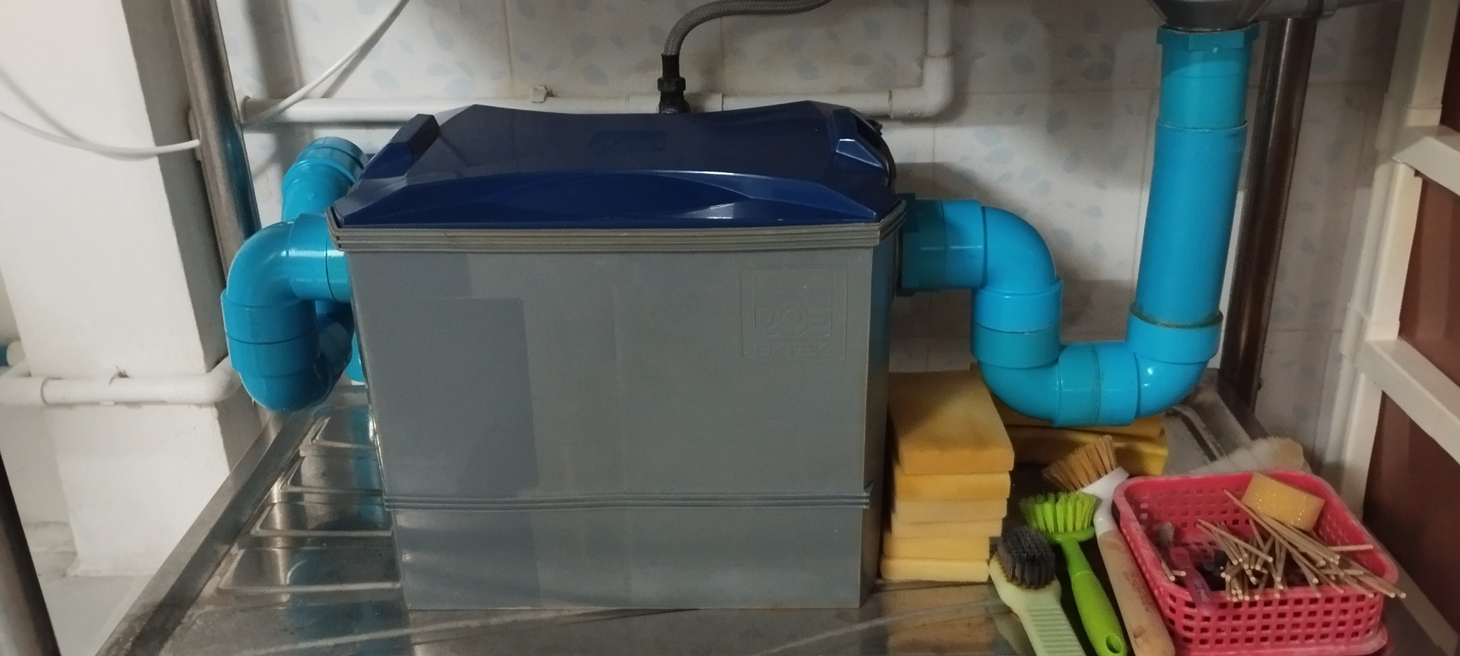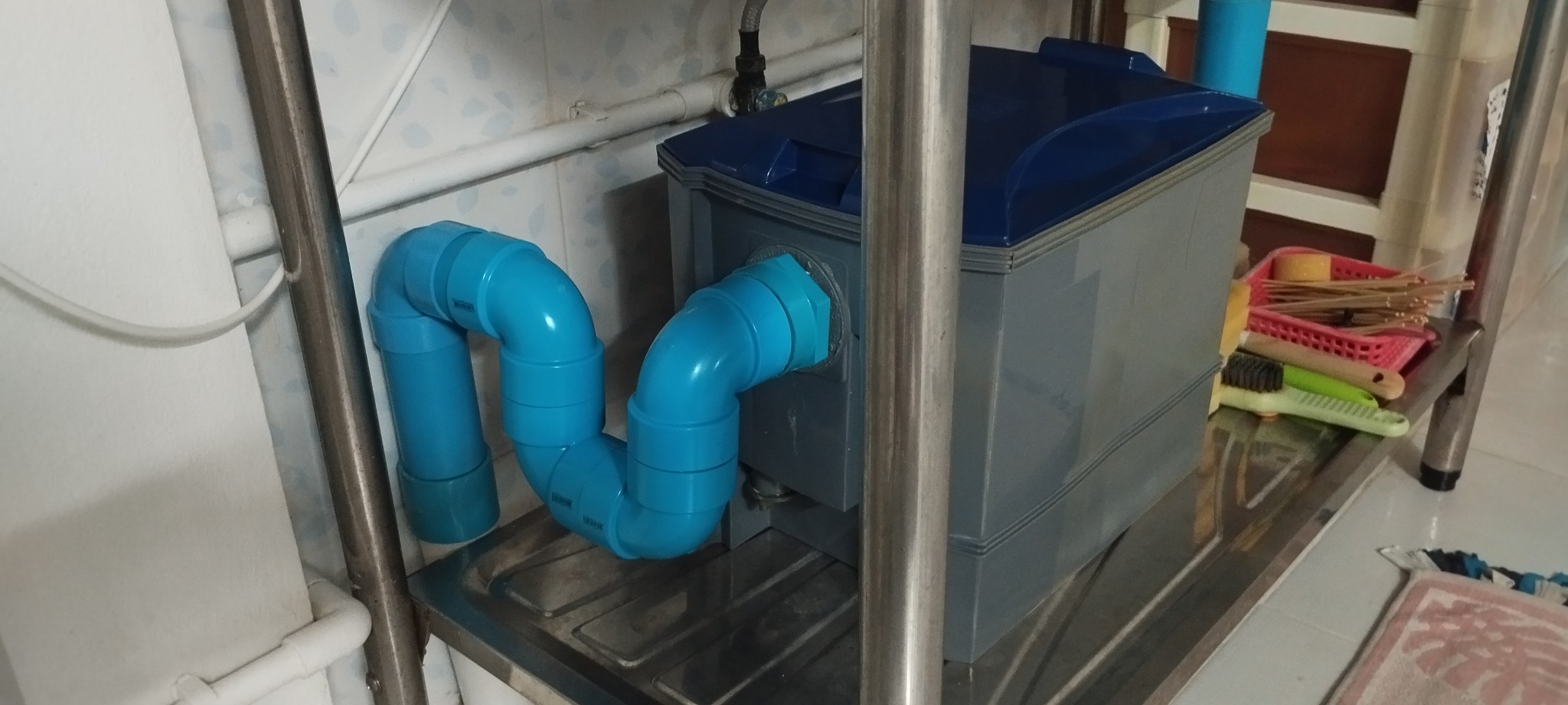 2. ถังดักไขมัน DOS ใต้อ่างล้างจาน พ่อบ้านทำ ท่องอเป็นตัว U ทั้งด้านน้ำออกและน้ำเข้าถัง เพื่อกันแมลงสาบ ดักกลิ่น