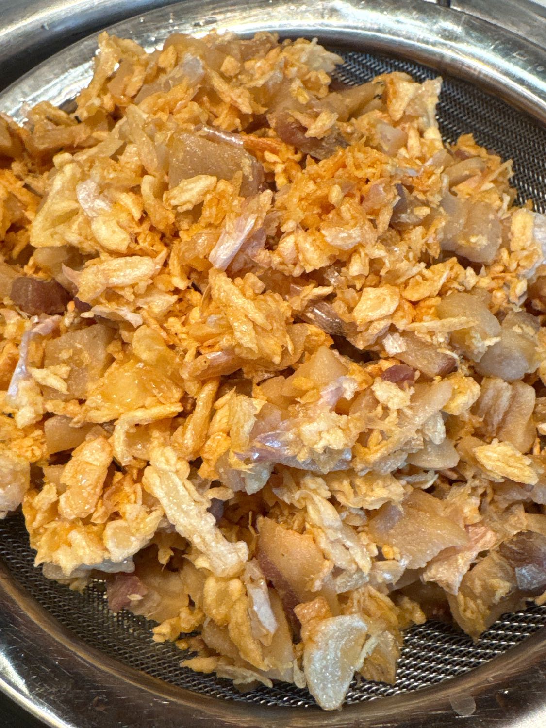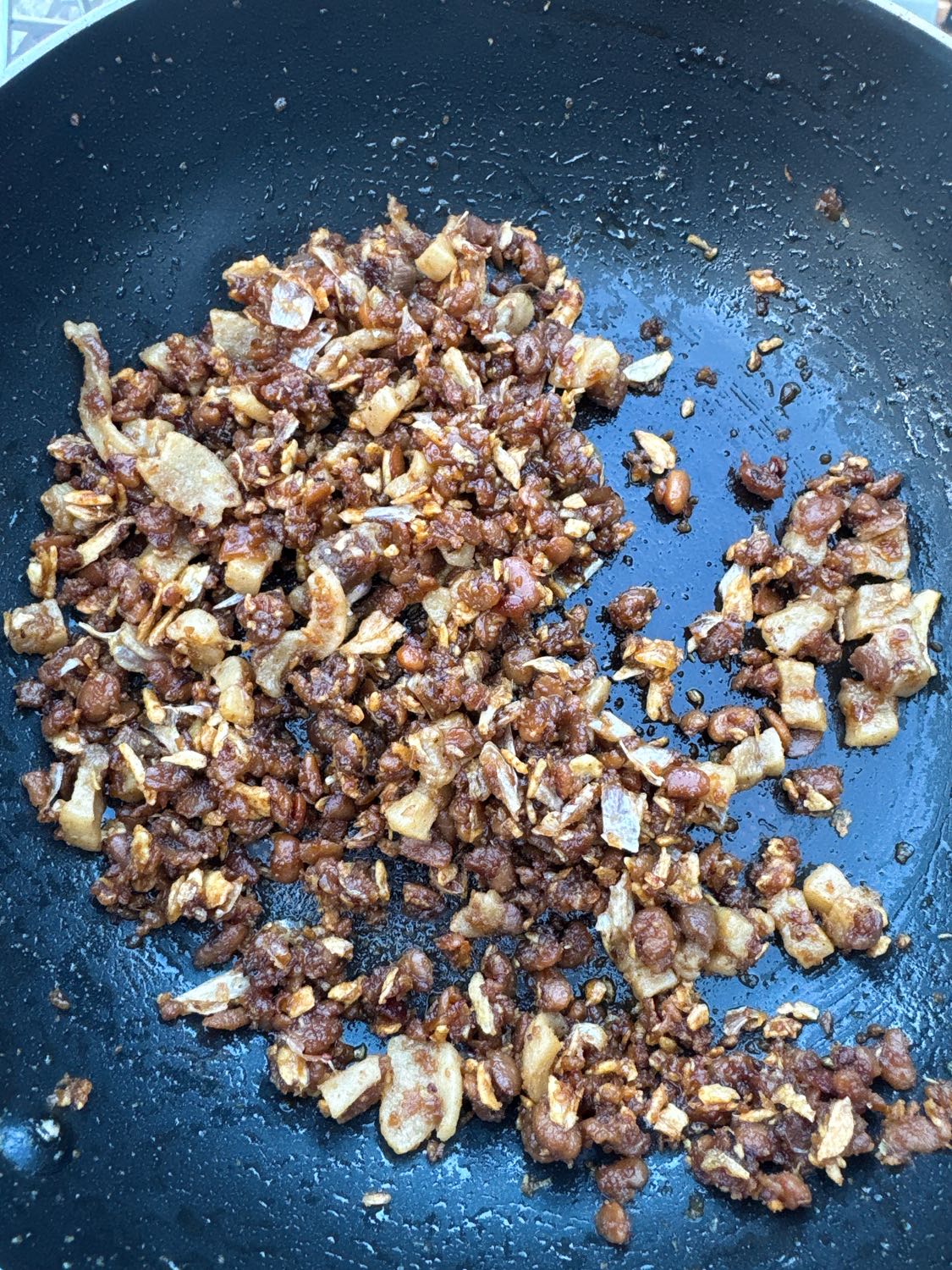 ผัดกับน้ำมันให้แห้ง แล้วใส่กระเทียมเจียวกากหมูไปผัดด้วยกัน ปรุงรสแค่น้ำตาลอย่างเดียว ค่อยๆใส่ แล้วชิมให้ออกเค็มๆหวานๆค่ะ
