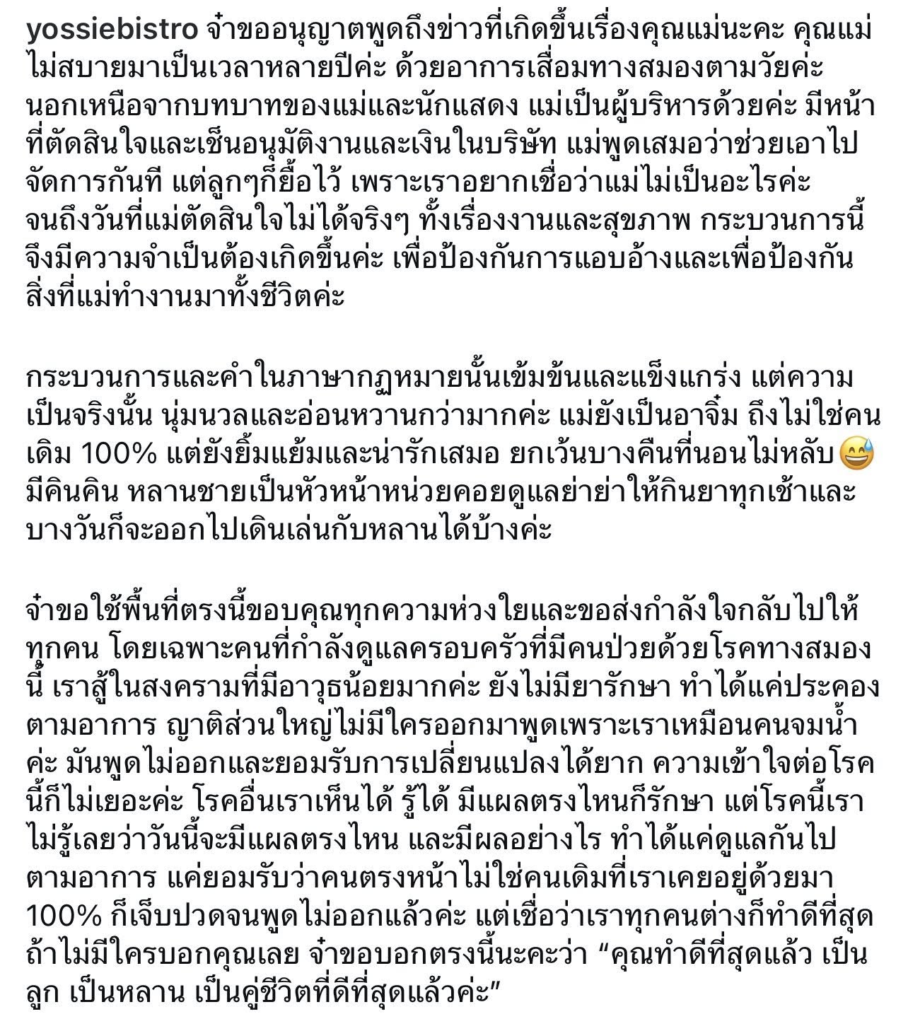 "จ๋าขออนุญาตพูดถึงข่าวที่เกิดขึ้นเรื่องคุณแม่นะคะ คุณแม่ไม่สบายมาเป็นเวลาหลายปีค่ะ ด้วยอาการเสื่อมทางสมองตามวัยค่ะ นอกเหนือจากบทบาทของแม่และนักแสดง แม่เป็นผู้บริหารด้วยค่ะ มีหน้าที่ตัดสินใจและเช็นอนุมัติงานและเงินในบริษัท แม่พูดเสมอว่าช่วยเอาไปจัดการกันที แต่ลูกๆก็ยื้อไว้ เพราะเราอยากเชื่อว่าแม่ไม่เป็นอะไรค่ะ จนถึงวันที่แม่ตัดสินใจไม่ได้จริงๆ ทั้งเรื่องงานและสุขภาพ กระบวนการนี้จึงมีความจำเป็นต้องเกิดขึ้นค่ะ เพื่อป้องกันการแอบอ้างและเพื่อป้องกันสิ่งที่แม่ทำงานมาทั้งชีวิตค่ะ