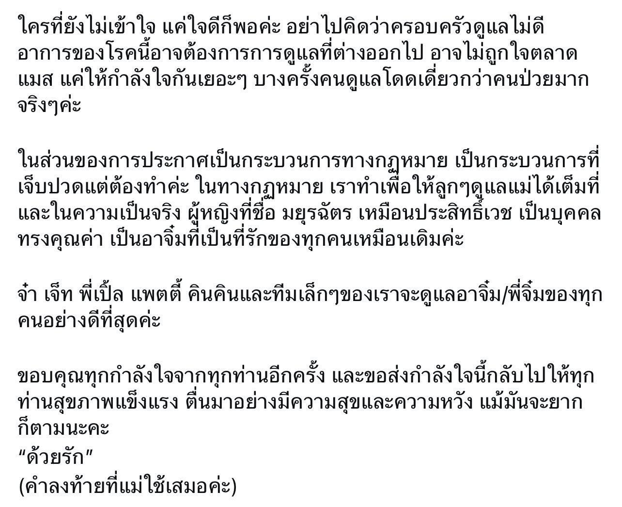 ในส่วนของการประกาศเป็นกระบวนการทางกฎหมาย เป็นกระบวนการที่เจ็บปวดแต่ต้องทำค่ะ ในทางกฎหมาย เราทำเพื่อให้ลูกๆดูแลแม่ได้เต็มที่ และในความเป็นจริง ผู้หญิงที่ชื่อ มยุรฉัตร เหมือนประสิทธิเวช เป็นบุคคลทรงคุณค่า เป็นอาจิ๋มที่เป็นที่รักของทุกคนเหมือนเดิมค่ะ
