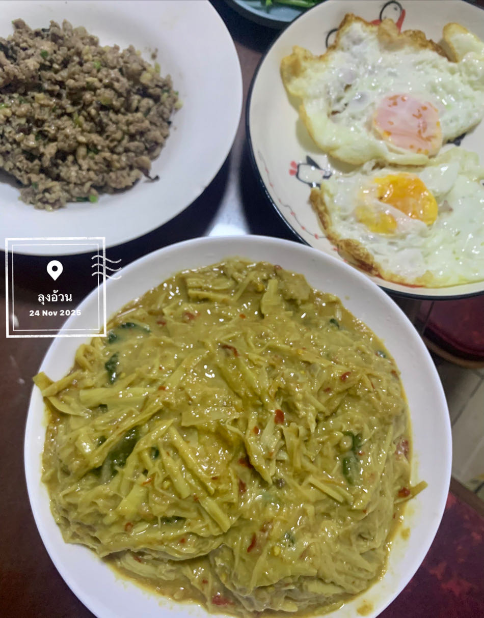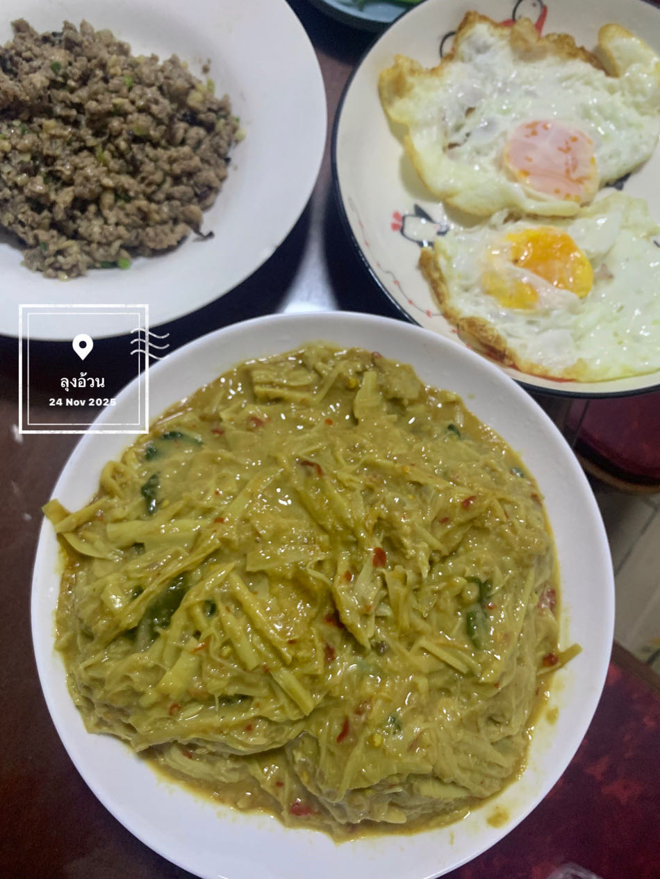 ลูกน้องเอาหมกหน่อไม้ใส่กะทิใส่หมูสามชั้นคั่วมาให้ อร่อยมาก