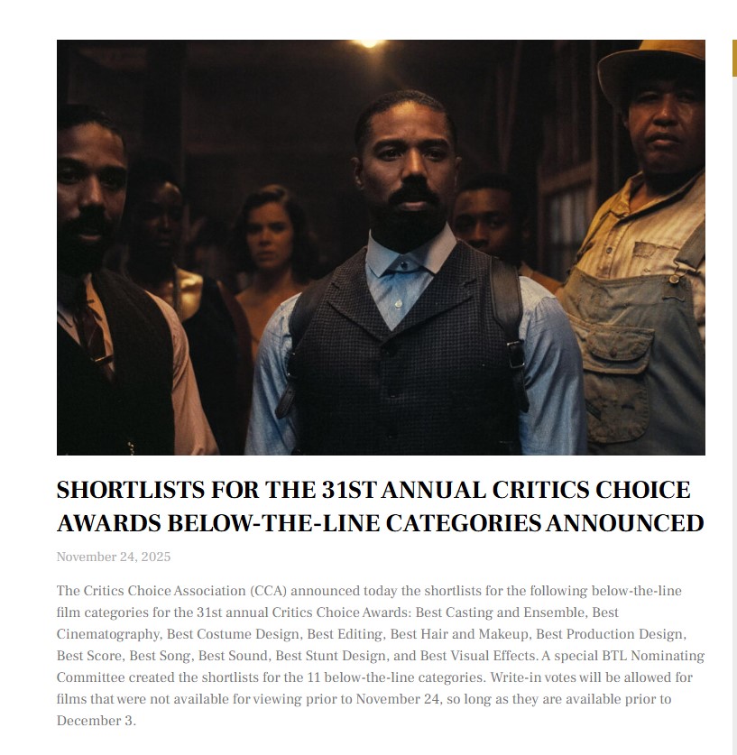 รางวัล Critics Choice Award ครั้งที่ 31 จะเริ่มทำการโหวตตั้งแต่วันที่ประกาศ Shortlist จนถึงวันที่ 3 ธ.ค. 2568 และจะประกาศรายชื่อผู้เข้าชิงรางวัล Critics Choice Award ทั้งสายภาพยนตร์ และโทรทัศน์ในวันที่ 5 ธ.ค. 2568