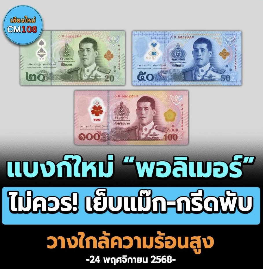 24 พ.ย. 68 - ธนาคารแห่งประเทศไทย เตือนข้อควรระวังในการใช้ธนบัตรพอลิเมอร์ ธนบัตรพอลิเมอร์ถูกออกแบบให้มีความทนทานมากกว่าธนบัตรกระดาษ ใช้วัสดุที่มีความทนทาน และก่อนออกใช้จะมีกระบวนการทดสอบความแกร่ง ทนต่อแรงดึง ทนต่อการพับ และการต้านทานการฉีกขาดให้ได้มาตรฐาน รวมทั้งสามารถนำไปล้างทำความสะอาดได้ โดยหากใช้งานธนบัตรพอลิเมอร์อย่างถูกวิธี จะมีอายุการใช้งานนานกว่าธนบัตรกระดาษ 4 เท่า