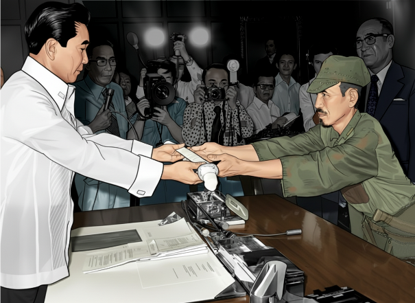 ในเดือนมีนาคม 1974 พันตรีทานิกุจิได้เดินทางไปลูบังและออกคำสั่งให้โอโนดะ ปลดประจำการ โอโนดะจึงยอมจำนนและมอบดาบ ซองปืนไรเฟิล กระสุนปืนกว่า 500 นัด และระเบิดมือที่เขารักษาไว้อย่างดีตลอด 29 ปี ให้กับประธานาธิบดีฟิลิปปินส์