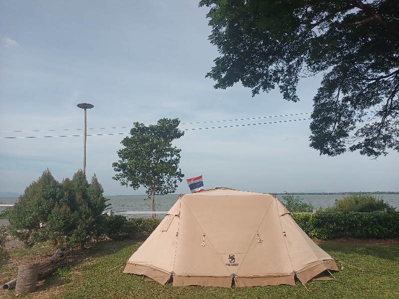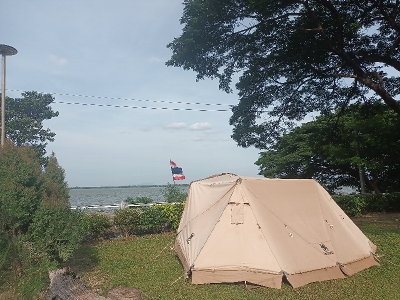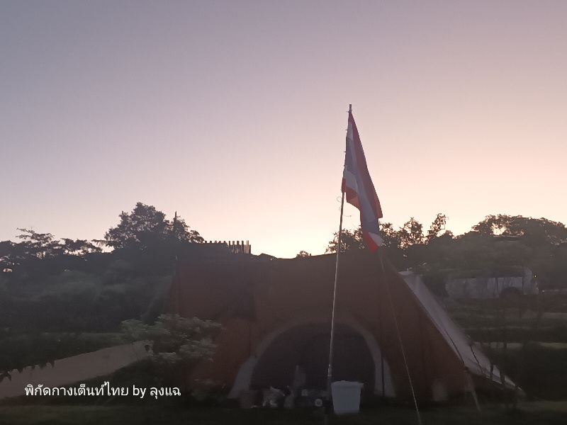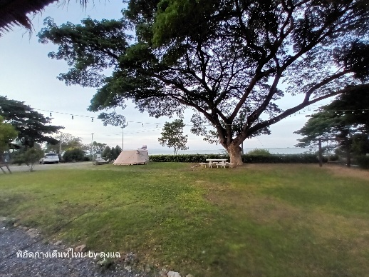 ลมพัดแรงปานกลางเป็นระยะๆ หญ้าเขียวดี แม้ไม่แน่นนุ่มเท้า มีร่มไม้ใหญ่ รีบกาง Bushcraft และอื่นๆ จนเสร็จบ่ายโมงครึ่ง