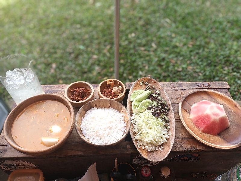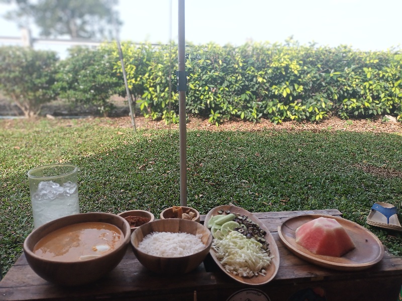 เตรียมมื้อเที่ยงต่อ ซื้อแกงน้ำยาจากตลาดสดมาแล้ว ทำเพิ่มนิดหน่อย มื้อเที่ยงก็พร้อม นั่งกินด้วยความอร่อยครับ (มื้อเช้าแวะซื้อลูกชิ้นทอด บ้าบิ่นรองท้องไป)