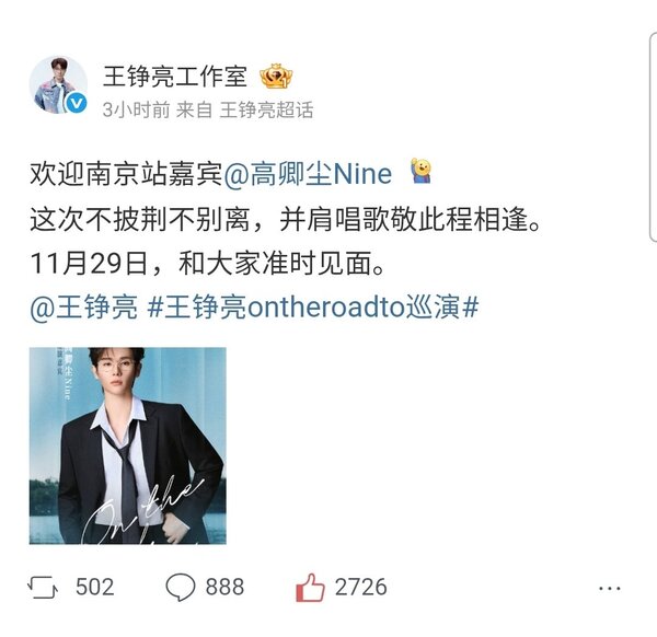 "น้องนาย" กรชิต บุญสถิต์ภักดี หรือ เกาชิงเฉิน เสียวจิ่ว (高卿尘 Nine) ศิลปินนักร้องนักแสดงจากประเทศไทย ได้รับเกียรติขึ้นเวทีเป็นเกสในทัวร์คอนเสิร์ตใหญ่ของ หวังเจิงเลี่ยง (王錚亮 ) โดยจะจัดขึ้นในวันที่ 29/11/2025 นี้