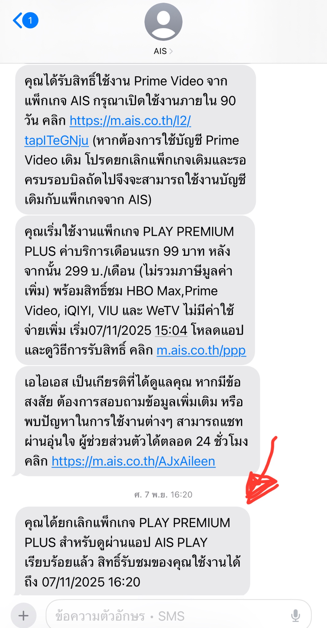 วันที่ 7 พฤศจิกายน 2568 มีบริการเสริมจากเอไอเอสโทรหาเรา เอไอเอสพรีเมี่ยมพลัส พอเรากดรับน้องเจ้าที่ก็คะยั้ยคะยอให้เรารับบริการ อาจเป็นเพราะเราใจอ่อนด้วย กับเคยสมัครแล้วก็ยกเลิกได้และไม่มีค่าใช้จ่ายตามมา เราเลยคิดว่าครั้งนี้ก็ไม่เป็นไร เราเลยบอกรับบริการ แต่ภายในวันเดียวกันเราก็กดยกเลิก ซึ่ง SMS ยกเลิกมันก็ขึ้นมาว่าได้ทำการยกเลิกแล้ว