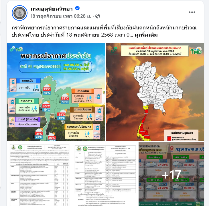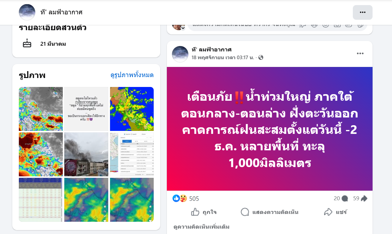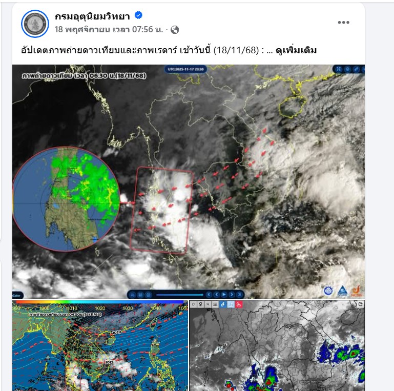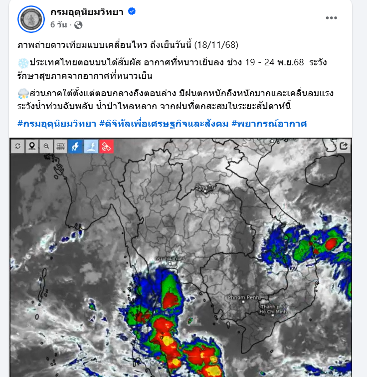 ในเพจกรมอุตุก็มีการพูดถึงฝนตกหนักในภาคใต้อยู่เป็นระยะ ๆ และมีการโพสต์มาตลอด โพสต์ภาพถ่ายดาวเทียม โพสต์สถานการณ์ตลอด