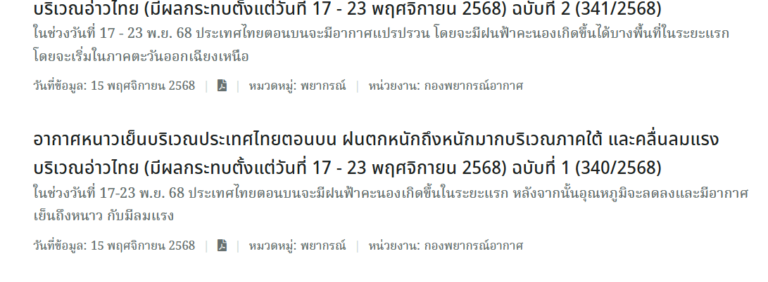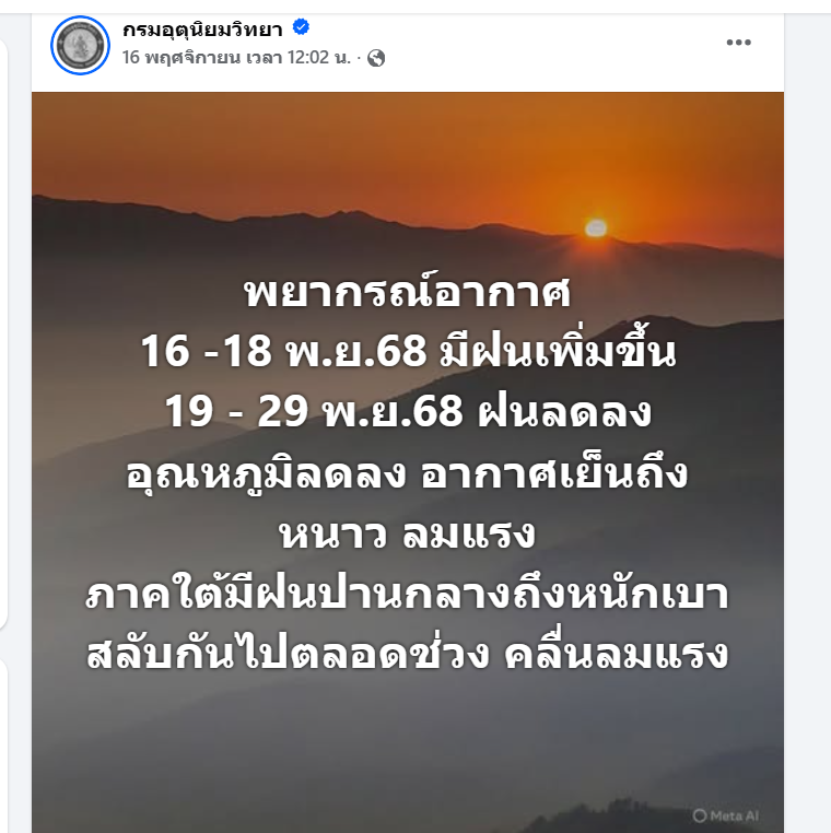 ในขณะที่กรมอุตุนิยมวิทยา ออกประกาศเตือนอากาศหนาวเย็นและฝนตกหนักในภาคใต้ฉบับแรก ในวันที่ 15 พฤศจิกายน 2568