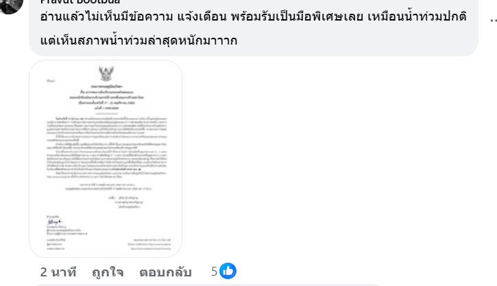 ถามว่า ทำไมกรมอุตุไม่บอกล่ะ ว่าฝนจะถล่มถึง 1000 มม. คือผมว่าบอกไปมันไม่มีประโยชน์อะ แต่หน่วยงานที่มีหน้าที่กู้ภัย และท้องที่ต้องเฝ้าระวังตามที่กรมอุตุเตือนสิ ฝนตกมันก็มีเลขรายงาน ก็ต้องมีการรายงานว่าฝนตกเท่านี้ตองอพยพได้แล้วนะ ผมก็ไม่รู้ว่ามีไหม เพราะว่าไม่มีใครสนใจกับคำเตือนพวกนี้เลย แถมด่ากรมอุตุไทยด้วย ก็พิมพ์แบบนั้นใครจะรู้ว่าน้ำจะท่วม