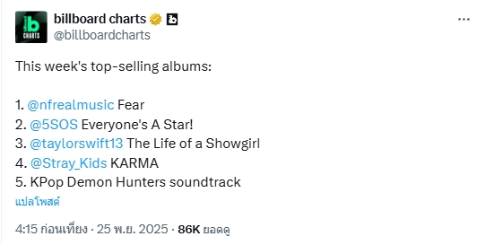 🔥 Stray Kids “KARMA” อัลบั้มที่ครองอันดับ 1 บนชาร์ต Billboard World Albums ยาวนานที่สุดในปี 2025 นี้ - “KARMA” อันดับ 1 อัลบั้มที่มีการขายและยอดสตรีมมิ่งสูงสุดทั่วโลก(ไม่