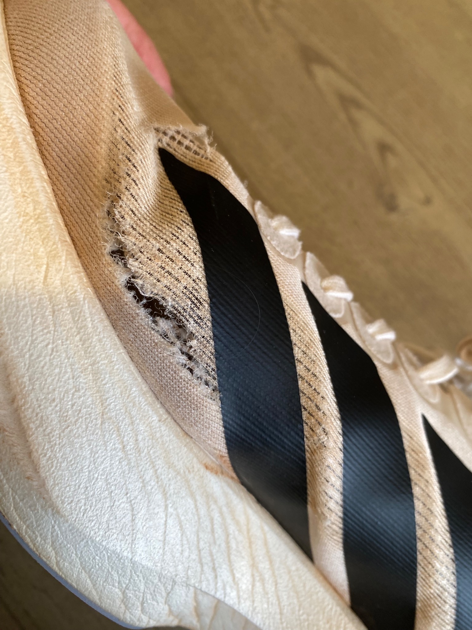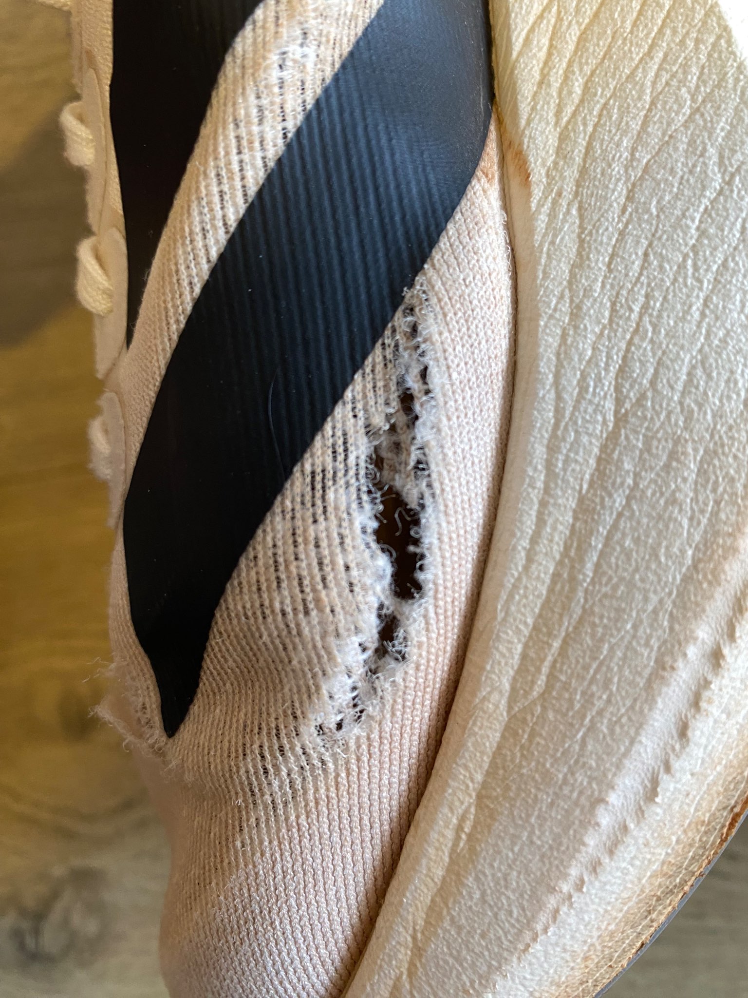 รองเท้าเริ่มขาดเป็นรูเล็กๆ หลังจากใส่ไปประมาณ เดือนกว่าๆ และขนาดเริ่มใหญ่ขึ้น จนสภาพเป็นตามในภาพ (ระยะทางที่ใส่วิ่งประมาณ 200 km)