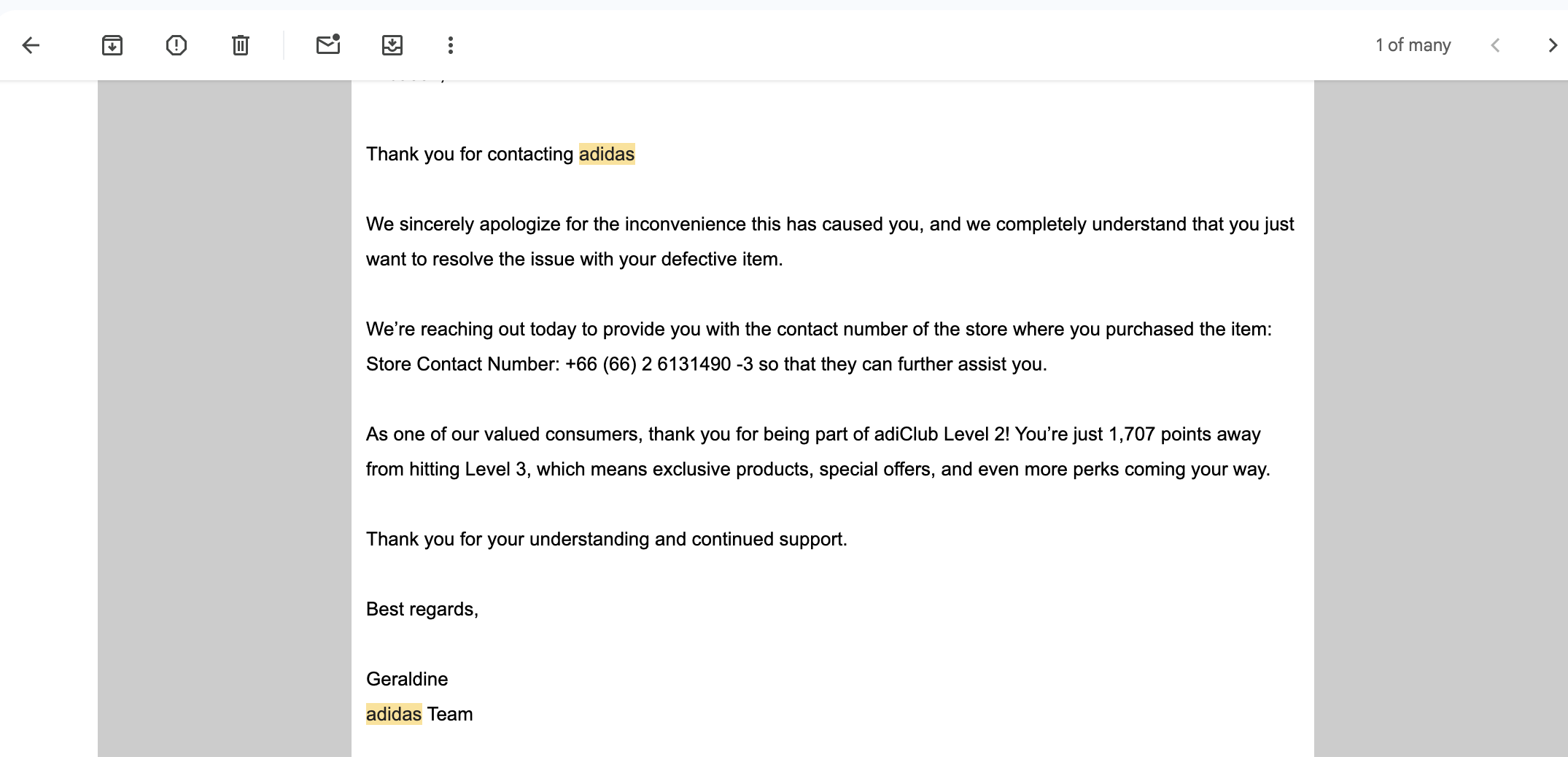 เบื้องต้นได้ติดต่อไปยัง Southeast Asia Customer Service เพื่อแจ้งว่าคุณภาพสินค้ามีปัญหา และทาง Southeast Asia Customer Service แจ้งว่าจะให้ติดต่อไปยังสาขาที่ซื้อ ซึ่งก็คือ Adidas สาขา Central World พอไปติดต่อที่สาขาพนักงานที่สาขาน่ารักมาก ช่วยรับเรื่องและไปแจ้งกับ Manager ให้แล้ว